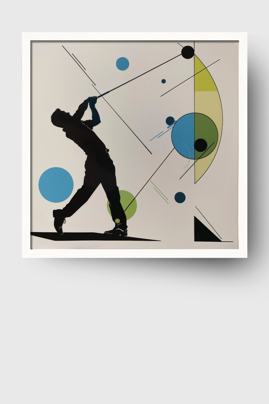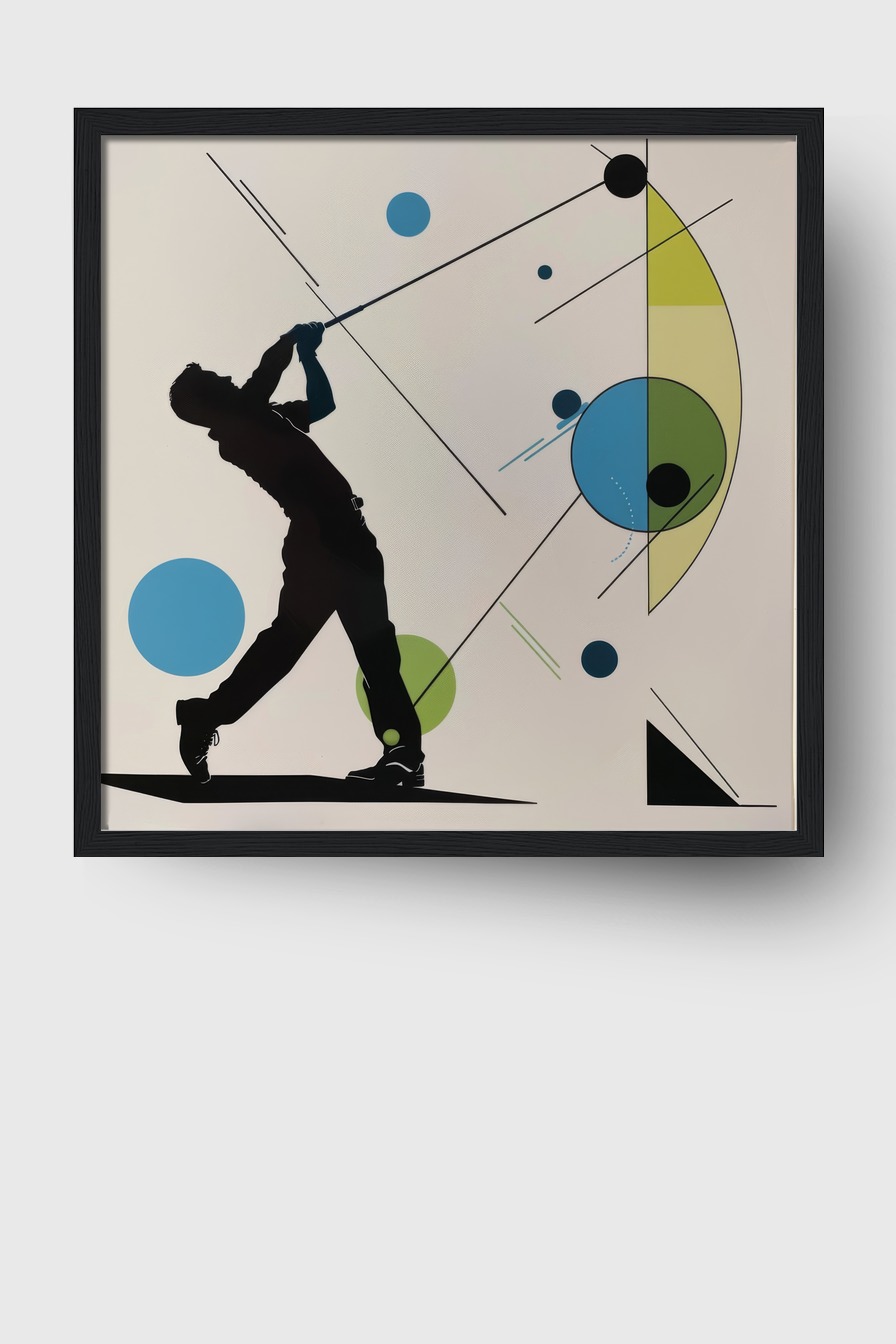 Golfer und geometrische Formen treten plastisch hervor. Im Raum wirkt die Szene wie ein eingefangener Moment, harmonisch und klar zugleich, fast wie ein modernes Stillleben mit dynamischer Spannung.