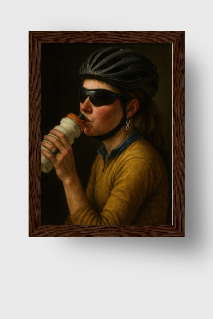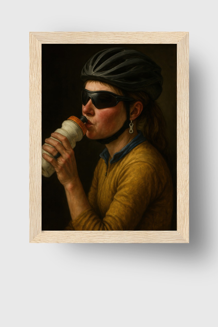 Porträt einer Frau mit Fahrradhelm und Sonnenbrille hinter bruchsicherem Plexiglas. Der Kiefernholzrahmen ist FSC-zertifiziert und in mehreren Farbtönen verfügbar. Fertig zum Aufhängen inklusive Set.