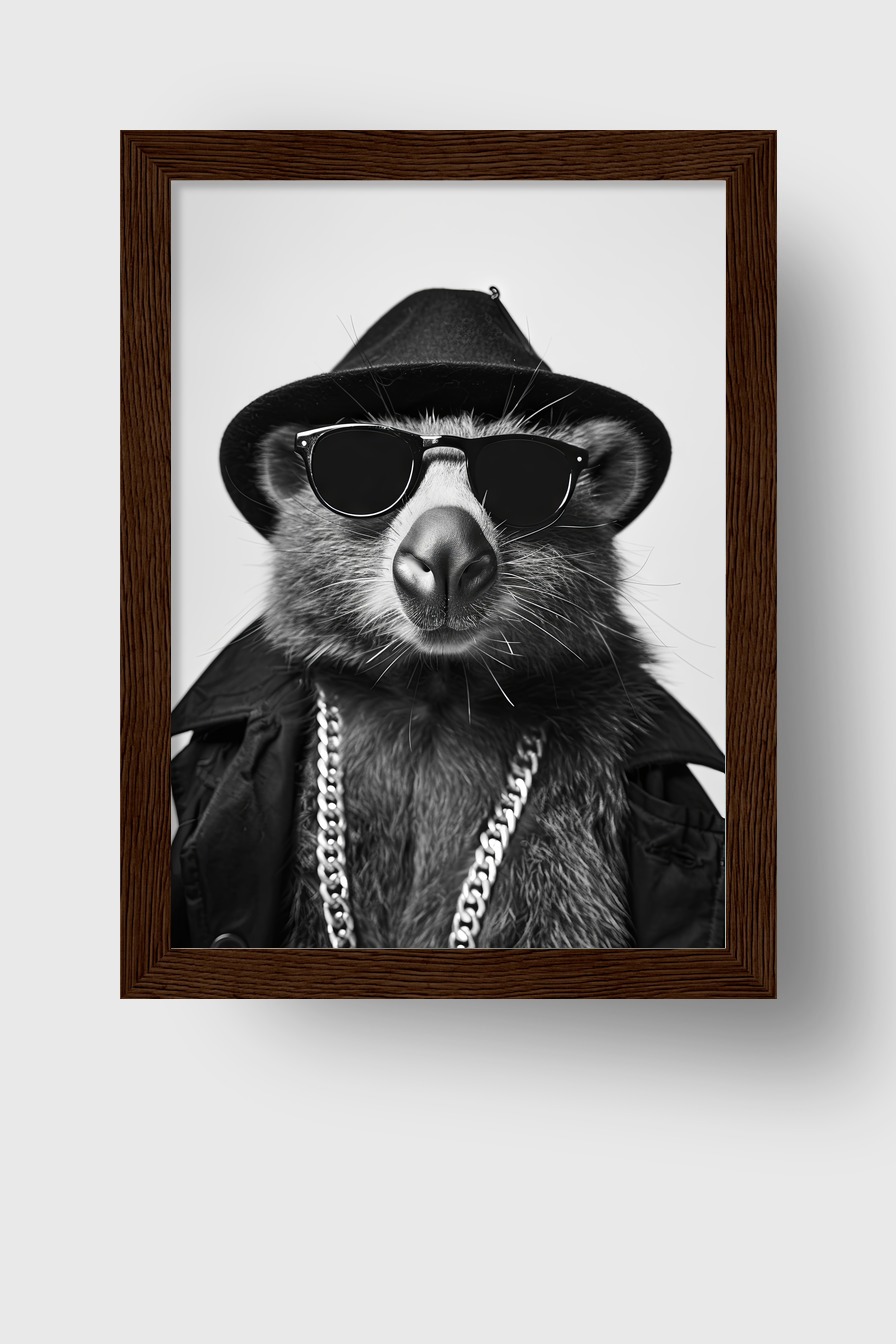Der schwarz-weiße Bär mit Hut hinter bruchsicherem Plexiglas auf 170 g/m² halbmattes Papier. Eingefasst in einen Kiefernholzrahmen (FSC-zertifiziert) in Schwarz, Weiß, Naturholz oder Dunkelbraun. Fertig zum Aufhängen mit beiliegendem Aufhängeset.