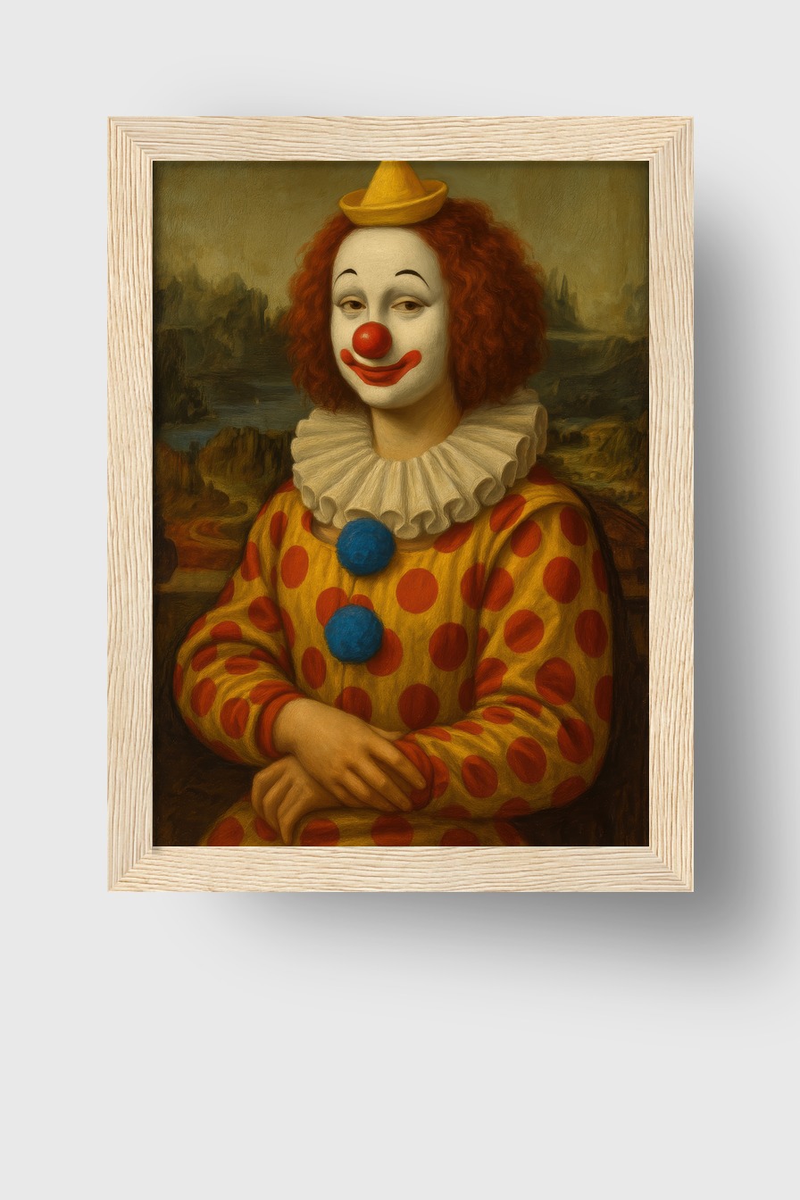 Clown-Porträtdruck auf halbmattem 170 g/m² Papier hinter bruchsicherem Plexiglas. Im Kiefernholzrahmen (FSC-zertifiziert). Fertig zum Aufhängen mit Aufhängeset.
