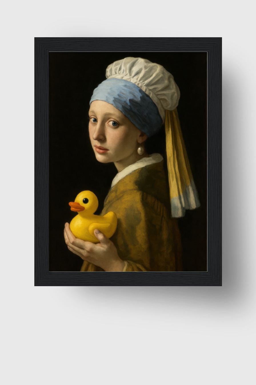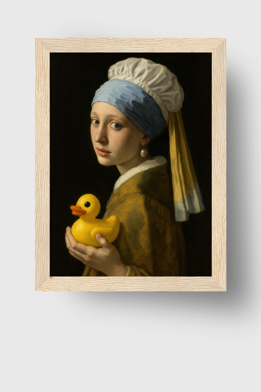 Porträt einer jungen Frau mit stillem Blick und Quietscheente. Poster (170 g/m², halbmatt) hinter bruchsicherem Plexiglas in FSC-zertifiziertem Kiefernholzrahmen. Erhältlich in verschiedenen Farben, fertig zum Aufhängen.