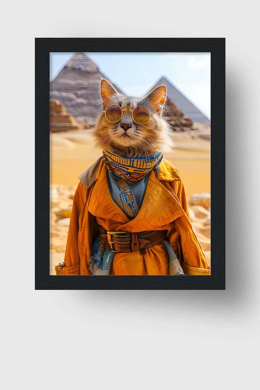 Poster (170 g/m², halbmatt) hinter bruchsicherem Plexiglas in Kiefernholzrahmen (FSC). Die stilvolle Katze mit Sonnenbrille vor Pyramiden erhält Tiefe und Präsenz. Fertig zum Aufhängen, inkl. Aufhängeset.