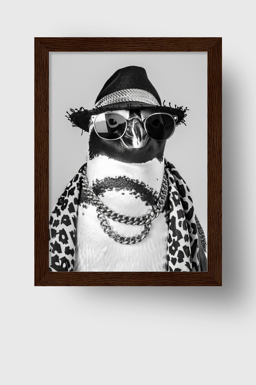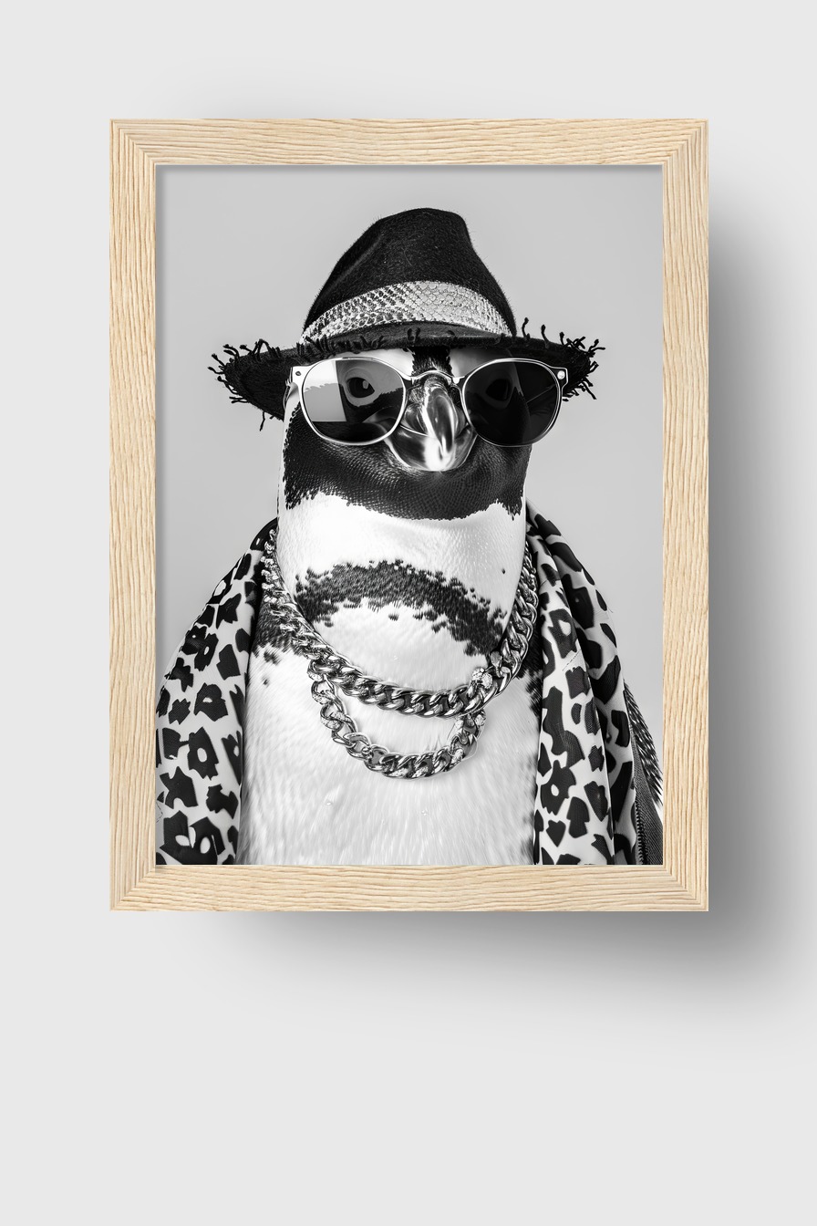 Schwarz-Weiß Poster mit Pinguin im Hut, Sonnenbrille und Ketten, lustiges Tierporträt in monochromer Darstellung