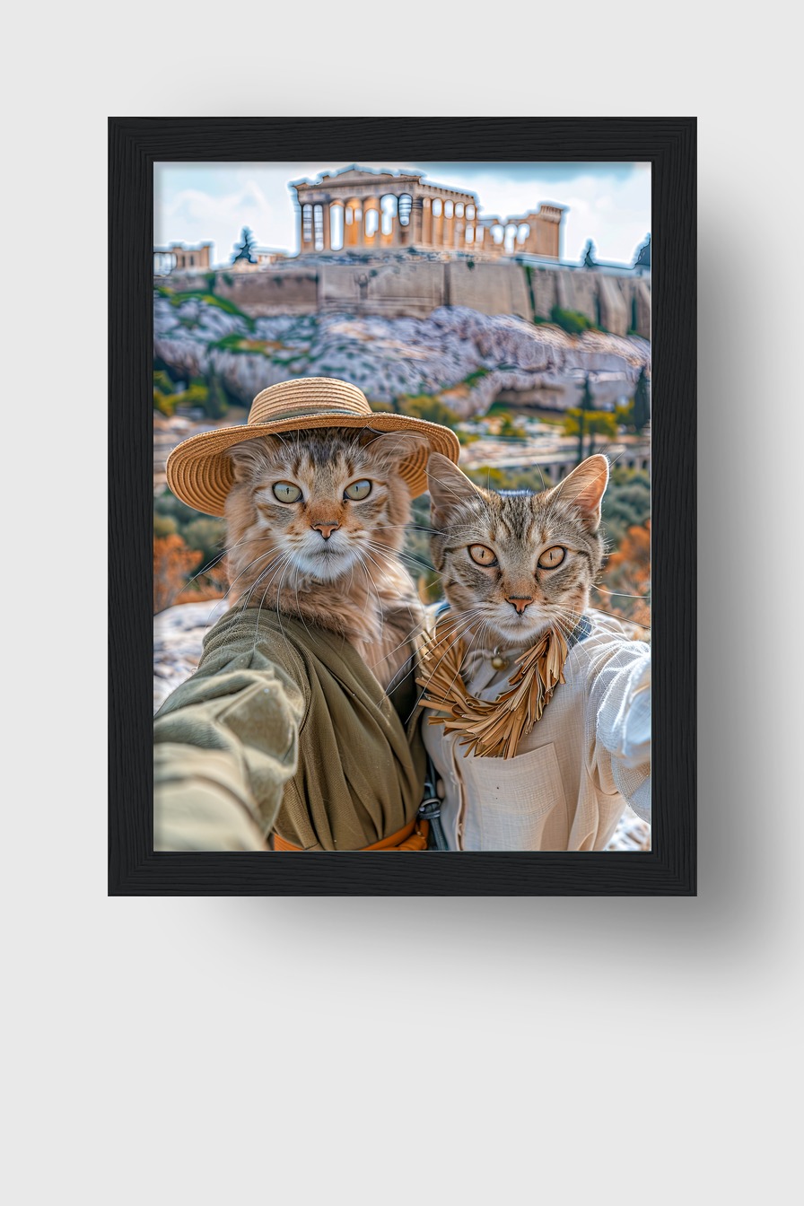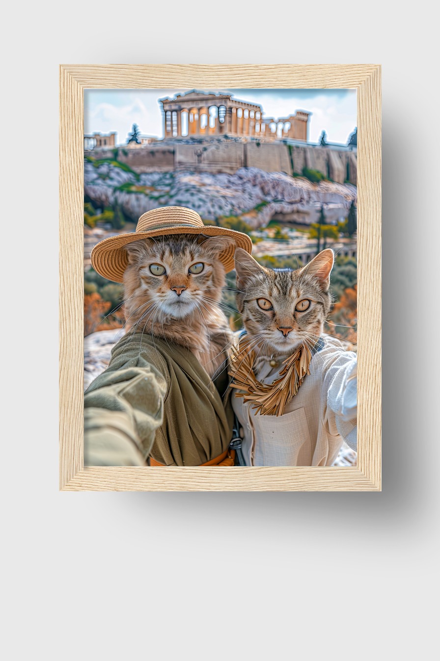 Poster hinter bruchsicherem Plexiglas im Kiefernholzrahmen (FSC-zertifiziert). Motiv zeigt zwei Katzen vor der Akropolis. Fertig zum Aufhängen, inklusive Aufhängeset.