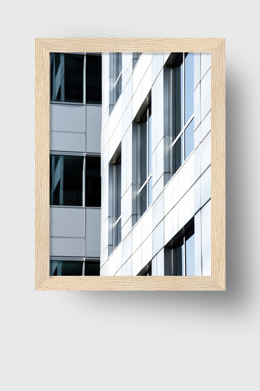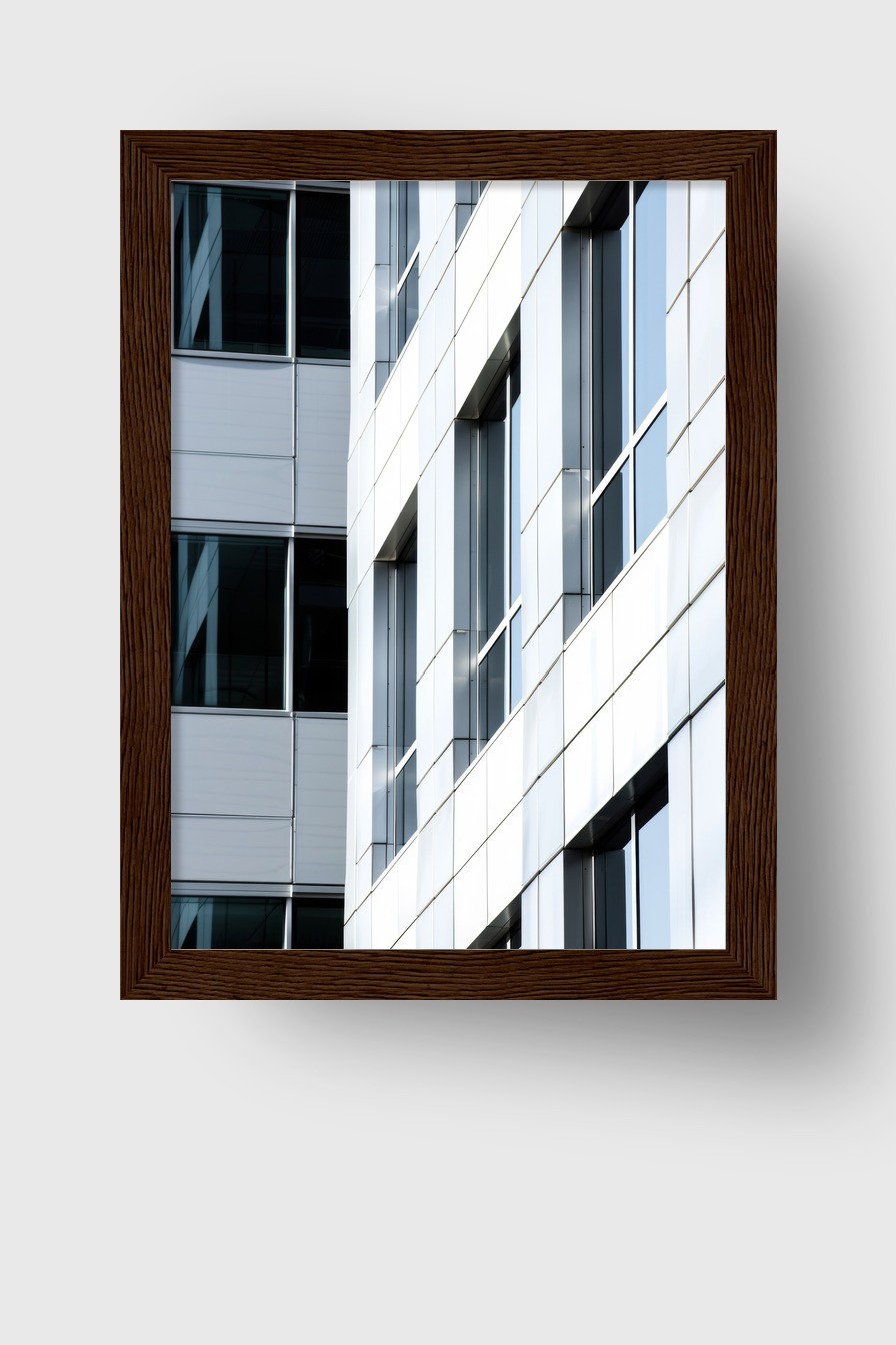 Glasfassade mit modernen Fenstern als Poster auf 170 g/m² halbmattem Papier hinter bruchsicherem Plexiglas. Kiefernholzrahmen FSC-zertifiziert, erhältlich in mehreren Farben. Fertig zum Aufhängen inklusive Aufhängeset.