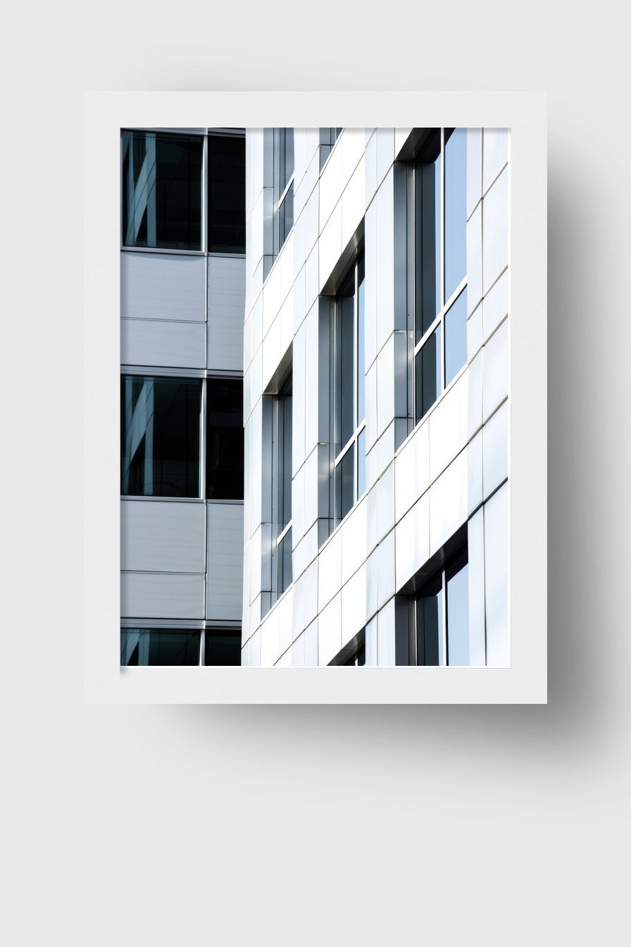 Poster einer modernen Glasfassade mit geometrischen Fenstern und klaren Linien, architektonischer Kunstdruck in Weiß- und Grautönen