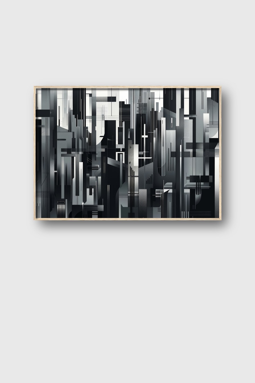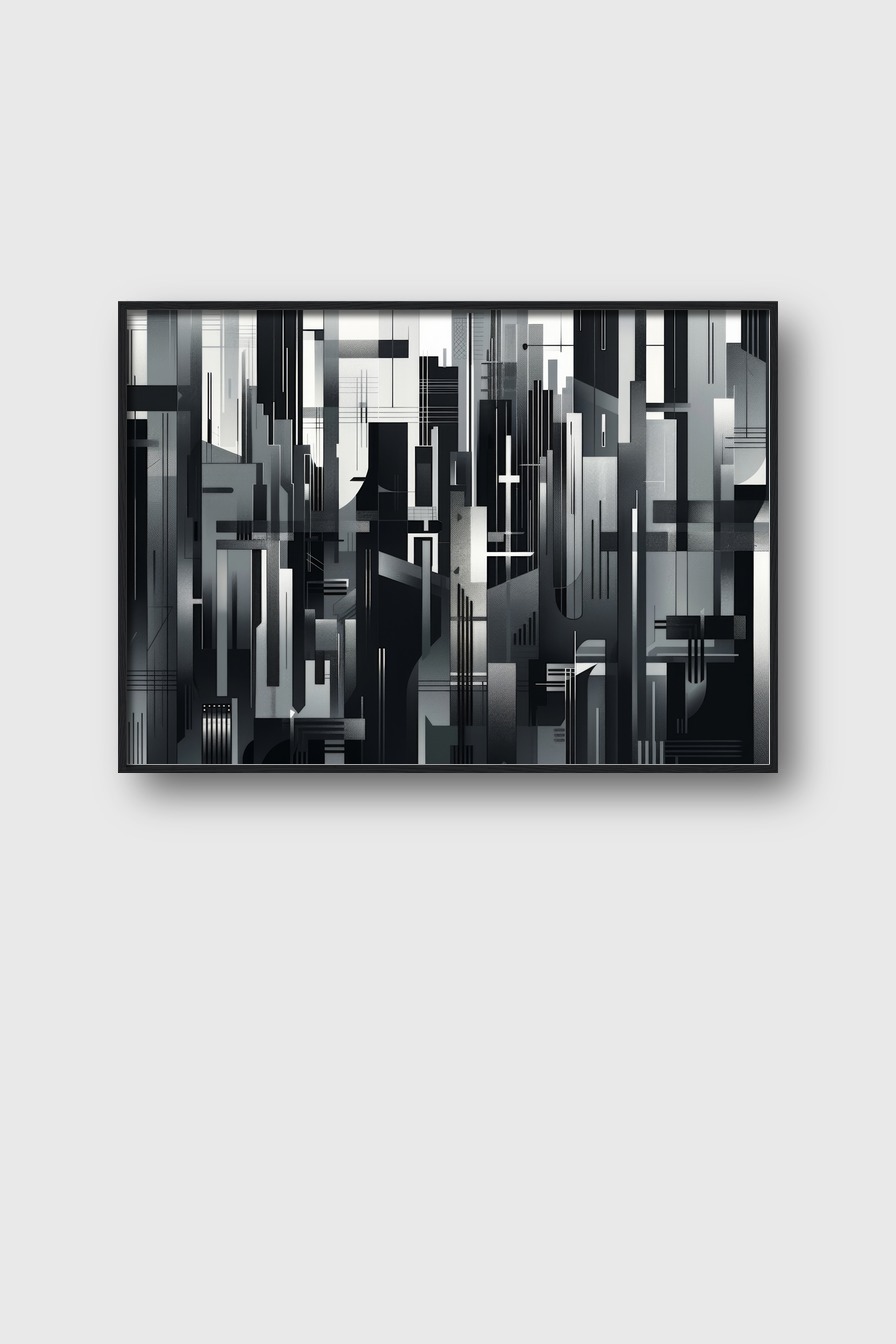 Schwarz-weiß Grafikkunst mit abstrakten Stadtlinien und Architekturmustern als Poster mit klaren geometrischen Formen