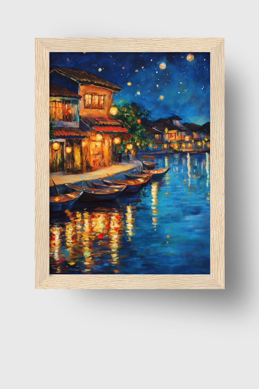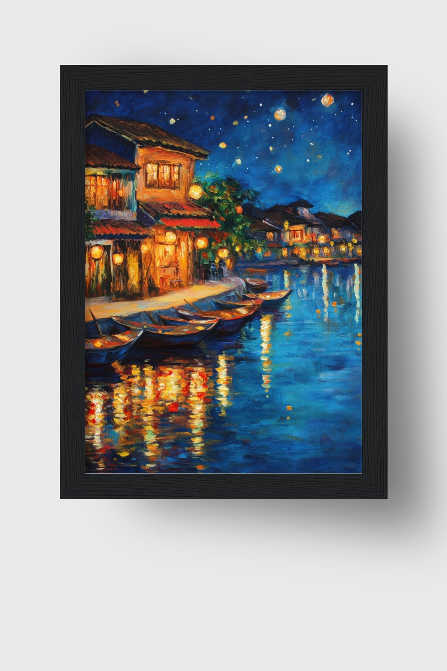 Kunstdruck mit nächtlicher Flussuferstraße, beleuchteten Häusern und Booten, die sich im Wasser spiegeln, in warmen Gelb- und Blautönen