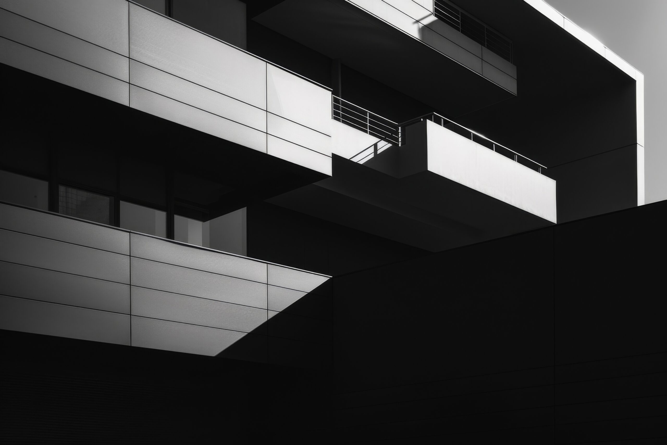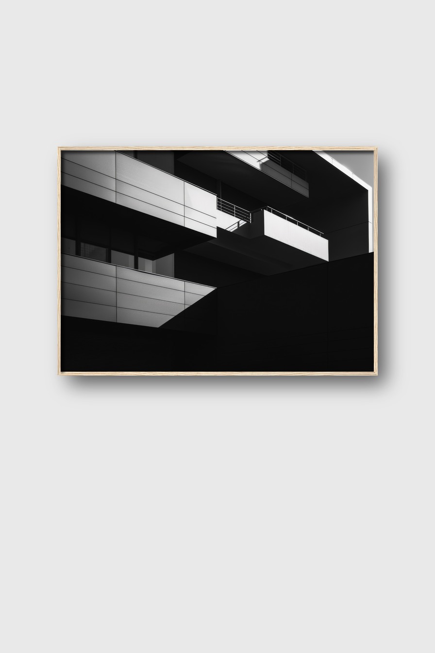 Dieses Bild wirkt im Raum wie ein grafisches Statement. Die feinen Linien der Balkone und das Spiel von Licht und Schatten bringen Schärfe und Tiefe in das Bild.