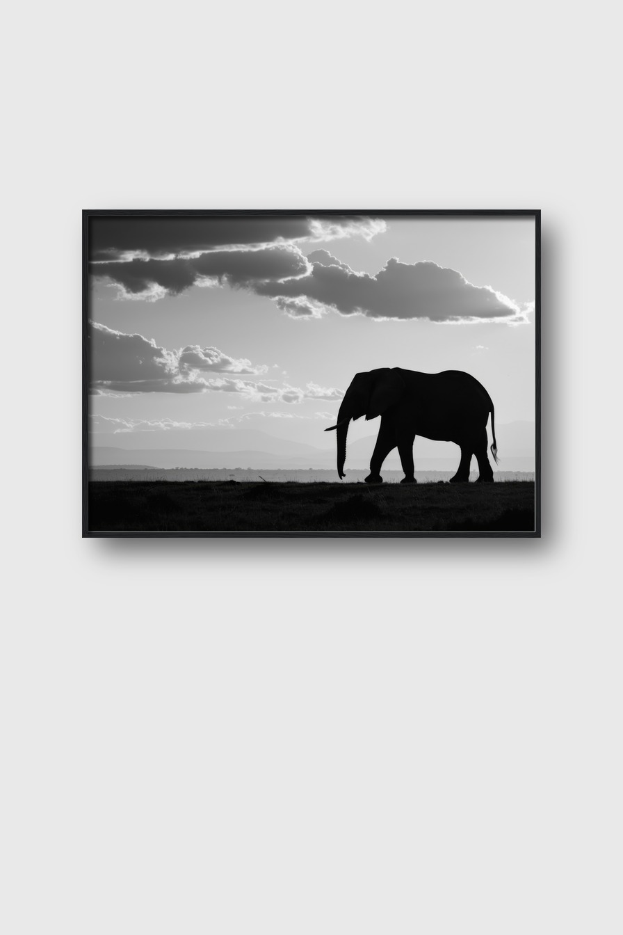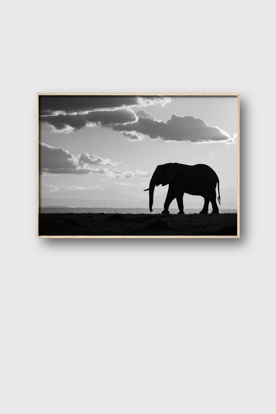 Ein einzelner Flug von Wolken über dem Elefanten bildet einen beeindruckenden Fokus, der dem Raum eine intensive und reduzierte Atmosphäre gibt.