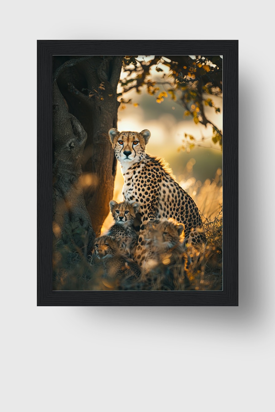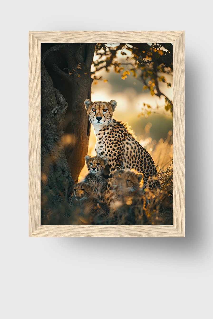 Portrait einer Gepardfamilie im goldenen Licht, eingefangen hinter bruchsicherem Plexiglas. Kiefernholzrahmen FSC-zertifiziert, fertig zum Aufhängen mit praktischem Montage-Set.