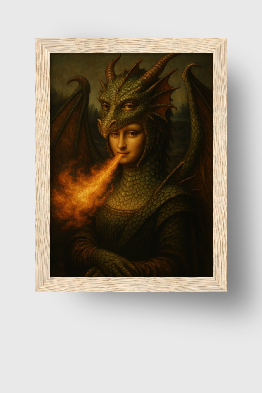 Mona Lisa mit Drachenhut und Feuer. Poster 170 g/m² halbmatt hinter bruchsicherem Plexiglas, gerahmt in FSC-Kiefernholzrahmen. Fertig zum Aufhängen.