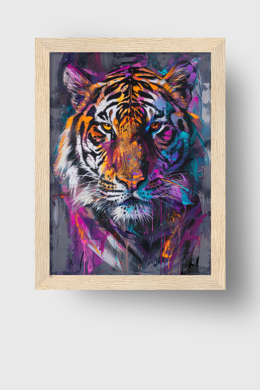 Tigerkopfumriss mit farbigen Akzenten als Poster (170 g/m², halbmatt) hinter bruchsicherem Plexiglas in einem Kiefernholzrahmen (FSC-zertifiziert). Erhältlich in Schwarz, Weiß, Naturholz oder Dunkelbraun. Komplett mit Aufhängeset, fertig zum Anbringen.