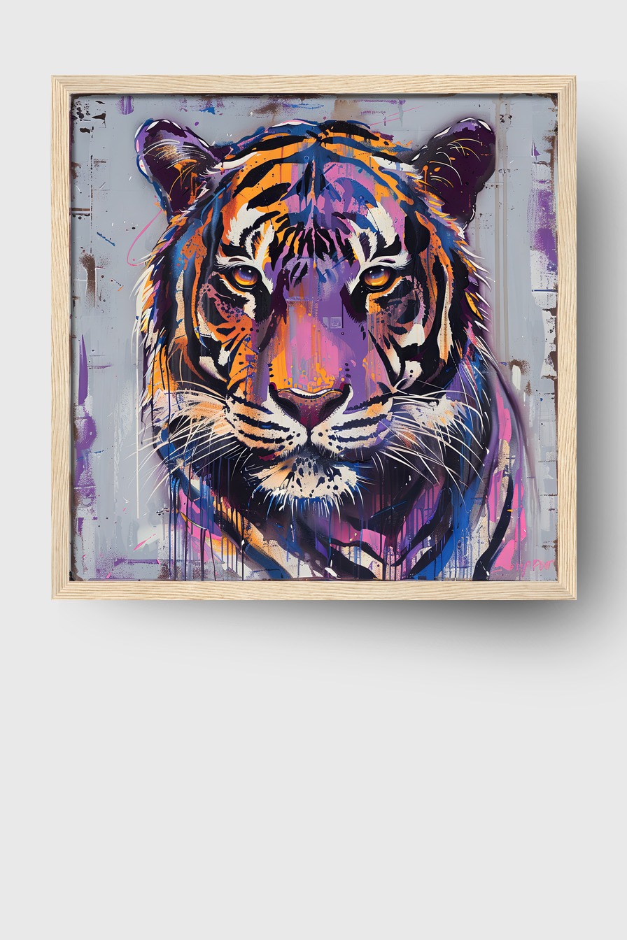 Tigerporträt als Poster (170 g/m², halbmatt) hinter bruchsicherem Plexiglas, gerahmt in FSC-Kiefernholz. In verschiedenen Rahmenfarben erhältlich. Fertig zum Aufhängen.