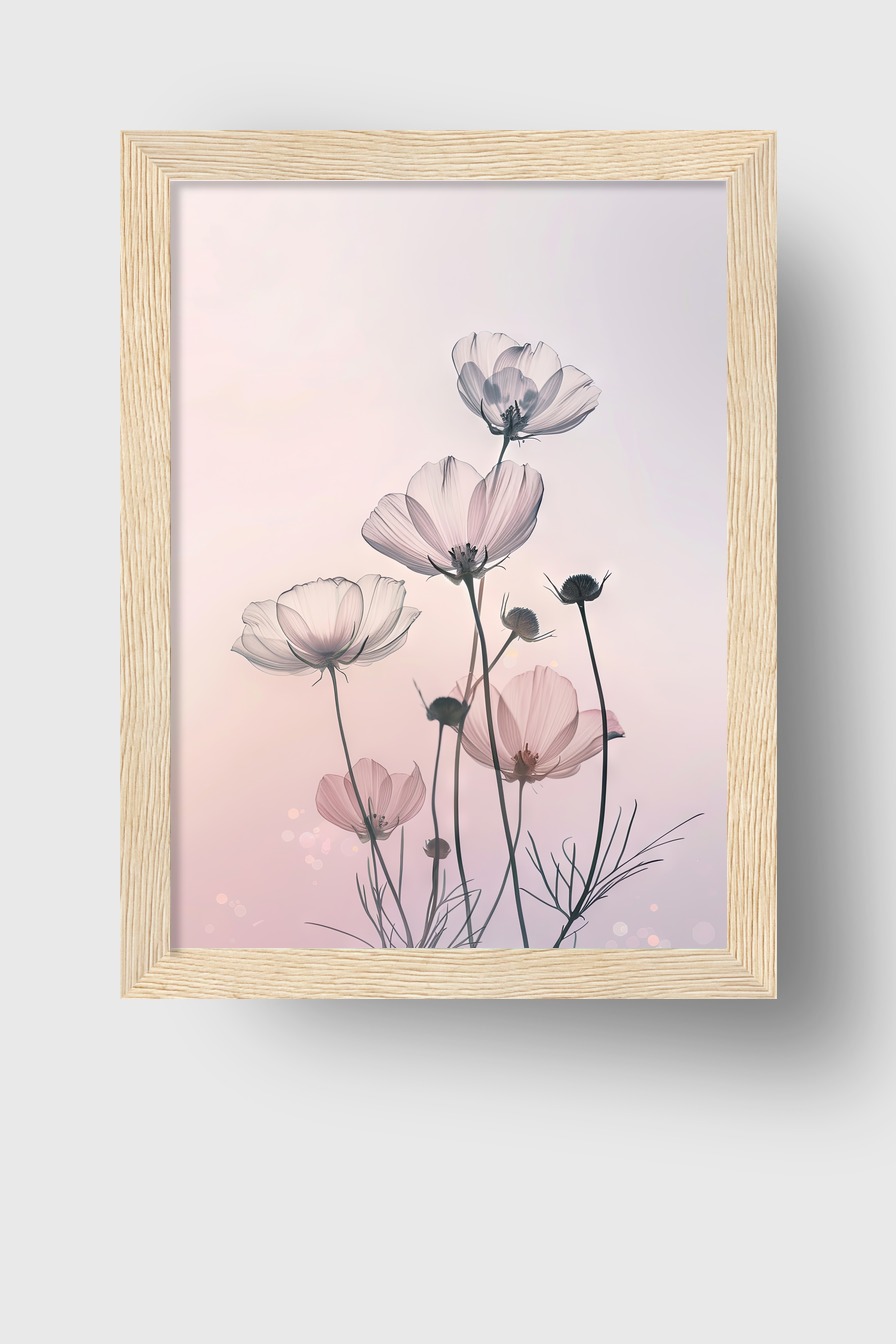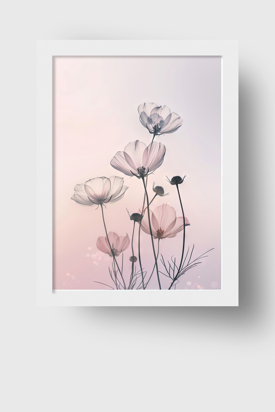 Sanfte Blütensilhouetten vor hellem, beruhigendem Hintergrund, klare Linien ohne Ablenkung