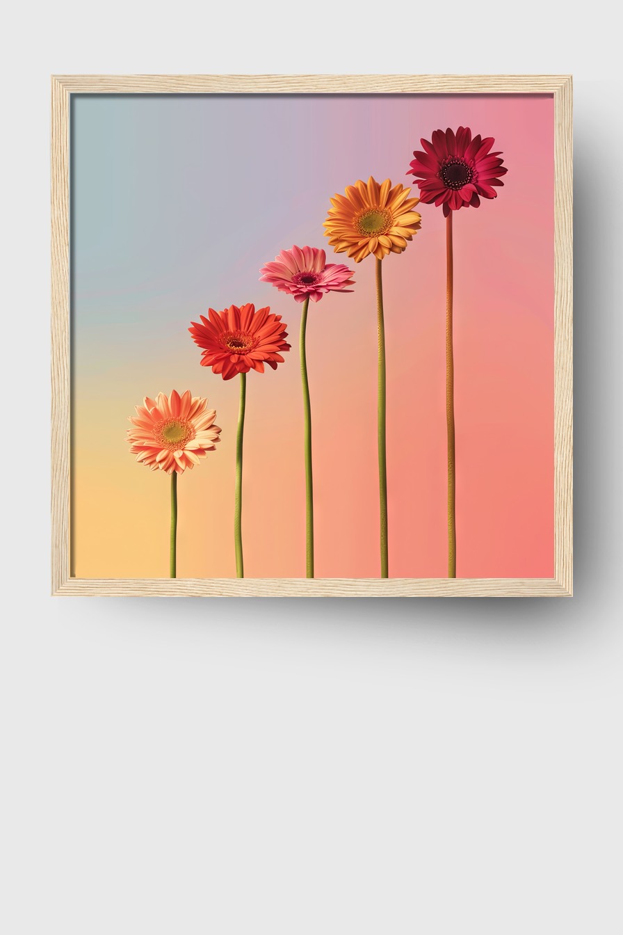Gerbera in verschiedenen Farben als Poster 170 g/m² halbmatt hinter bruchsicherem Plexiglas. Eingefasst in Kiefernholzrahmen FSC-zertifiziert in verschiedenen Farben. Fertig zum Aufhängen inklusive Aufhängeset.