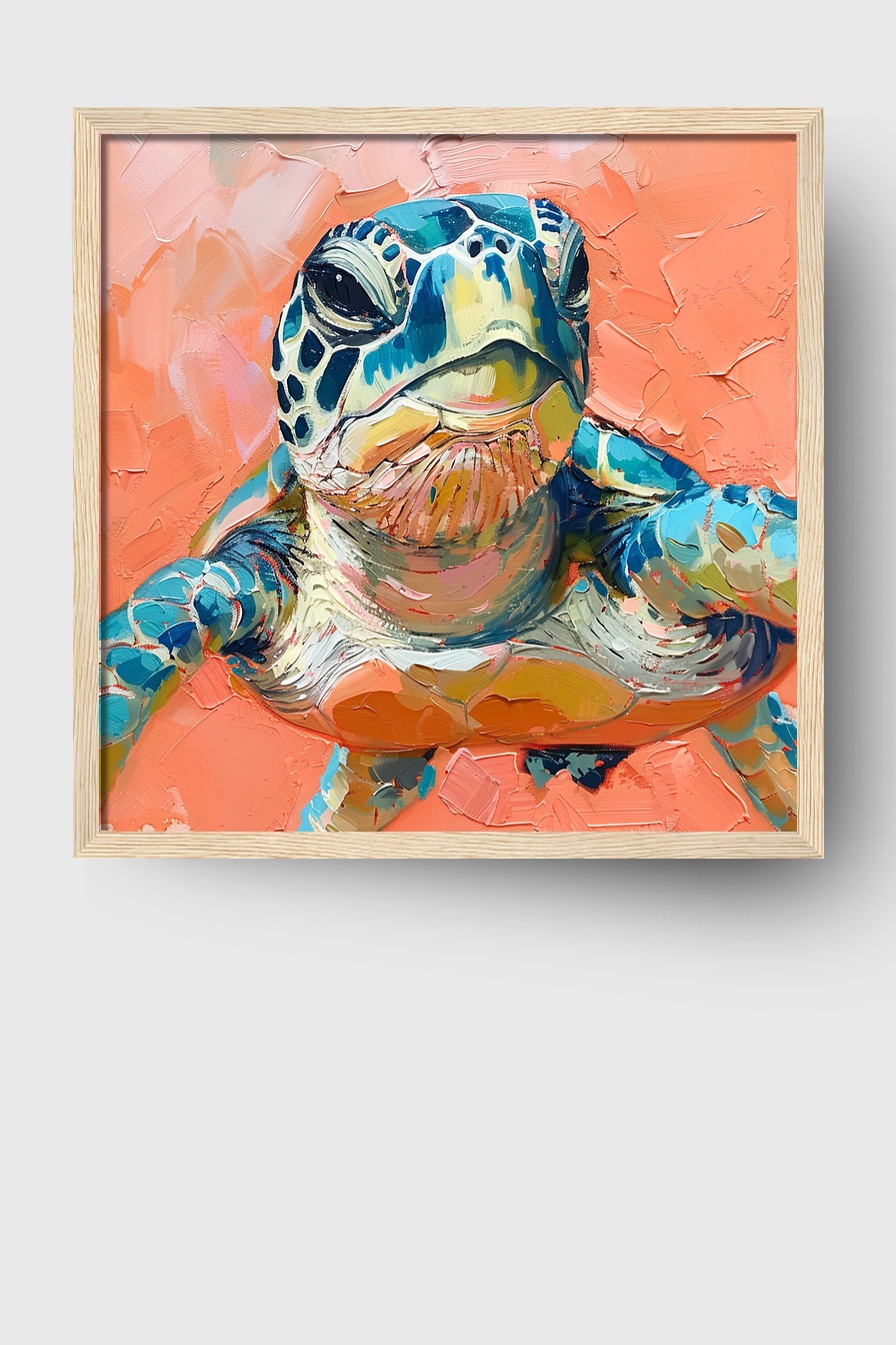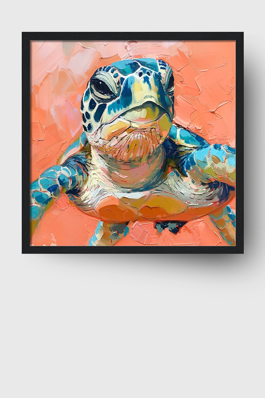 Im Raum wirkt die Schildkröte durch den starken Kontrast zwischen Brustpanzer und kräftigem Hintergrund lebendig und dynamisch. Ein Blickfang mit prägnanter Präsenz.