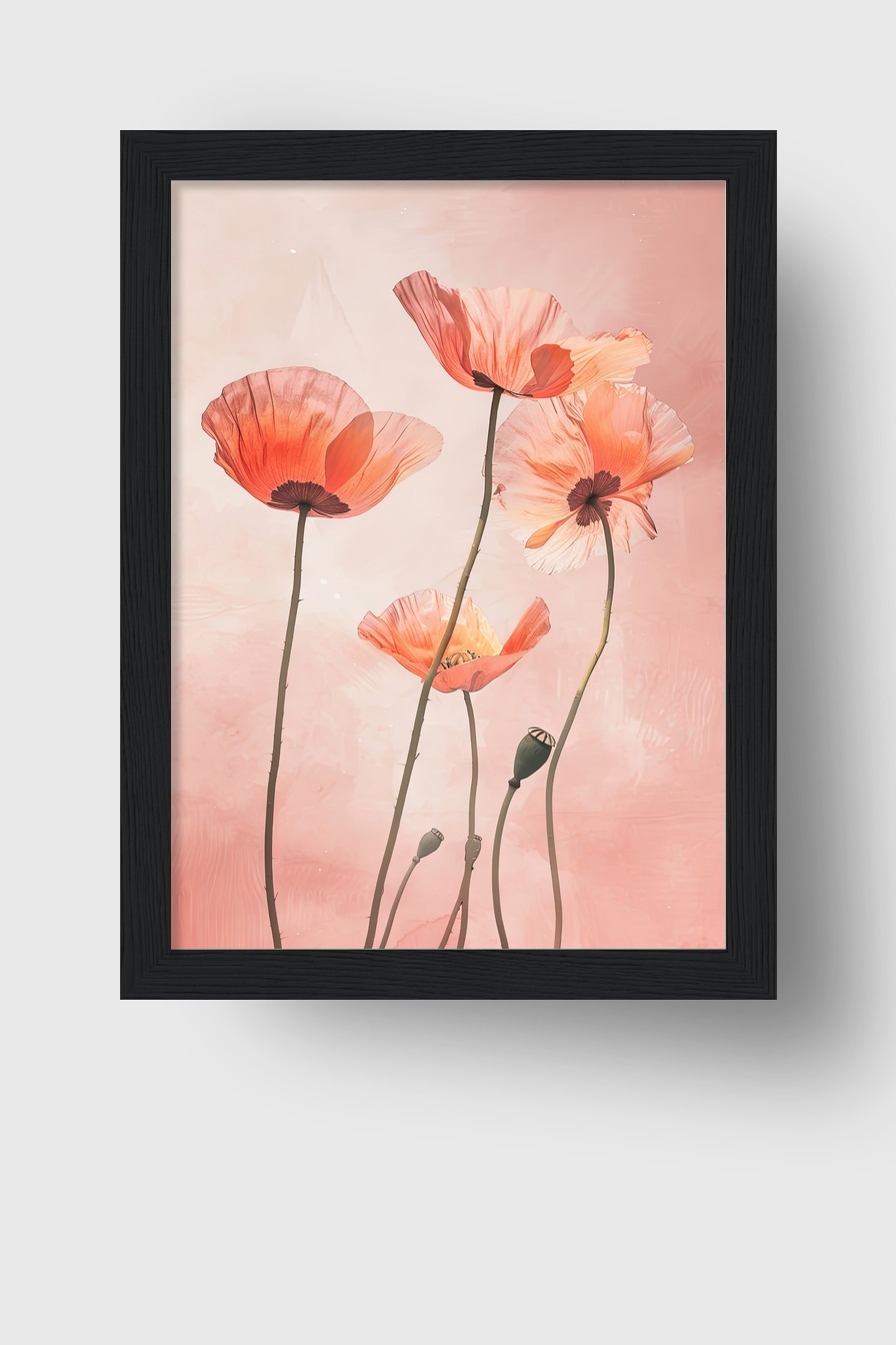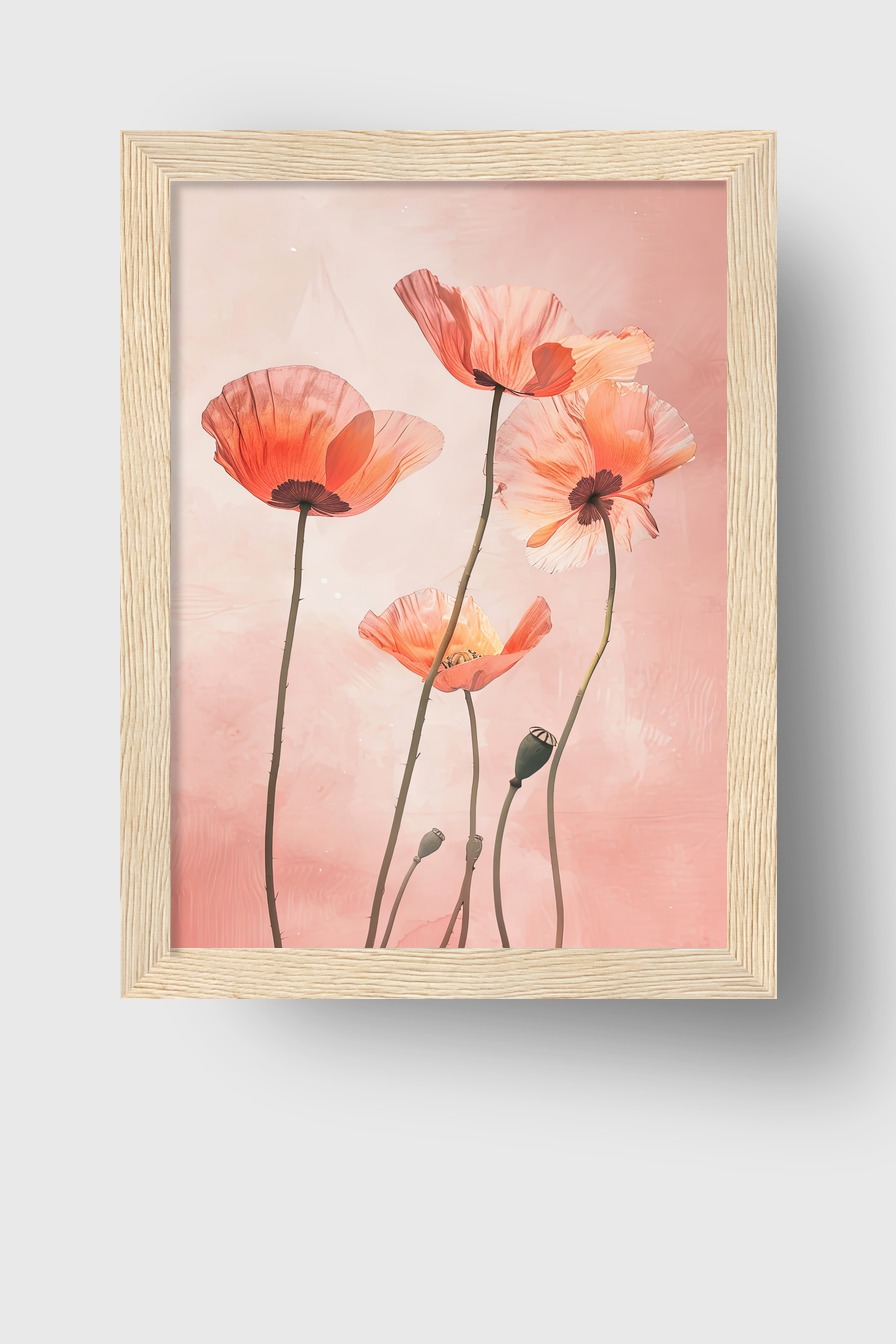 Das Motiv bringt filigrane Mohnblumen mit hellem Hintergrund als ruhiges, klares Bild in den Raum.