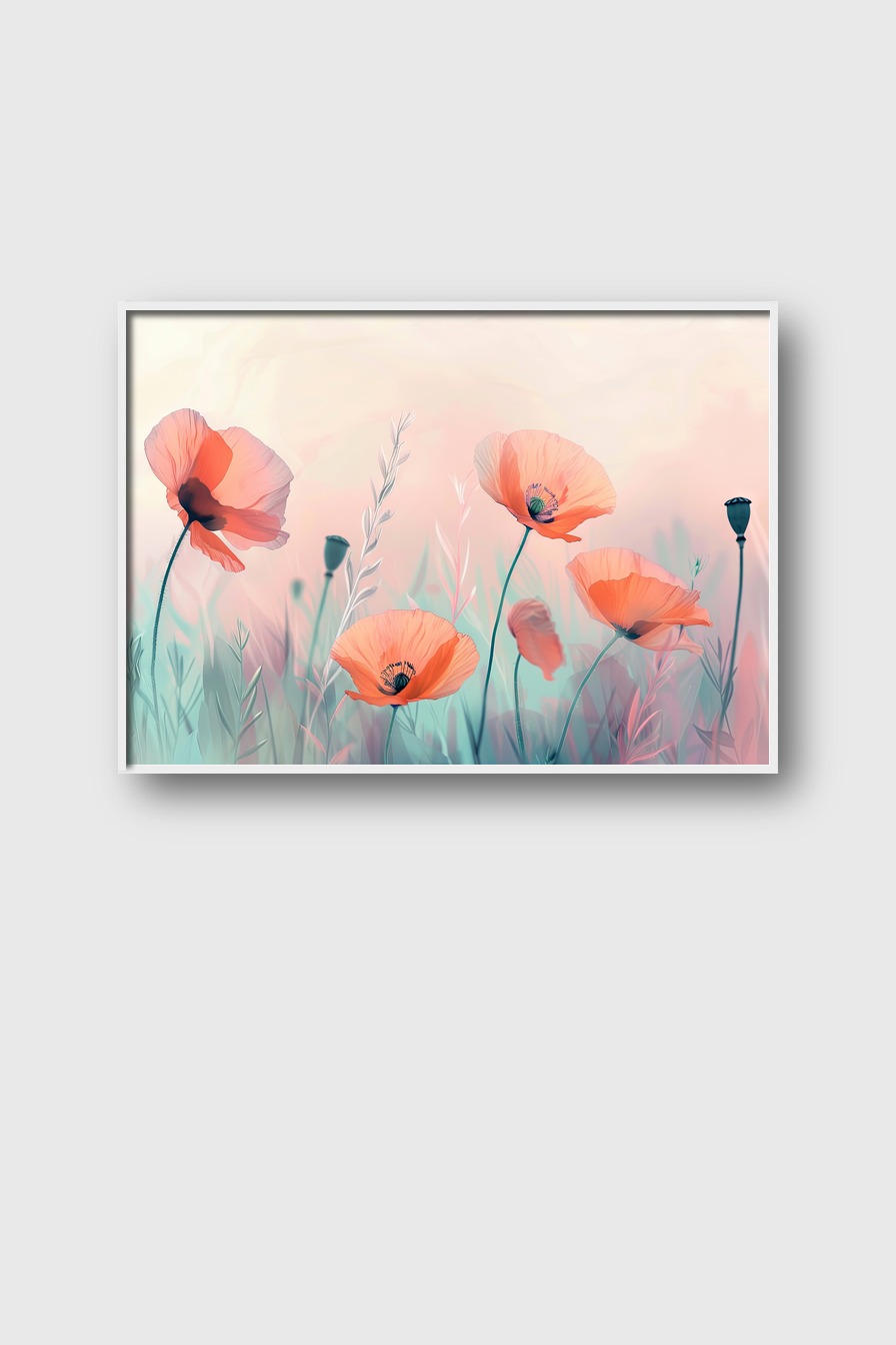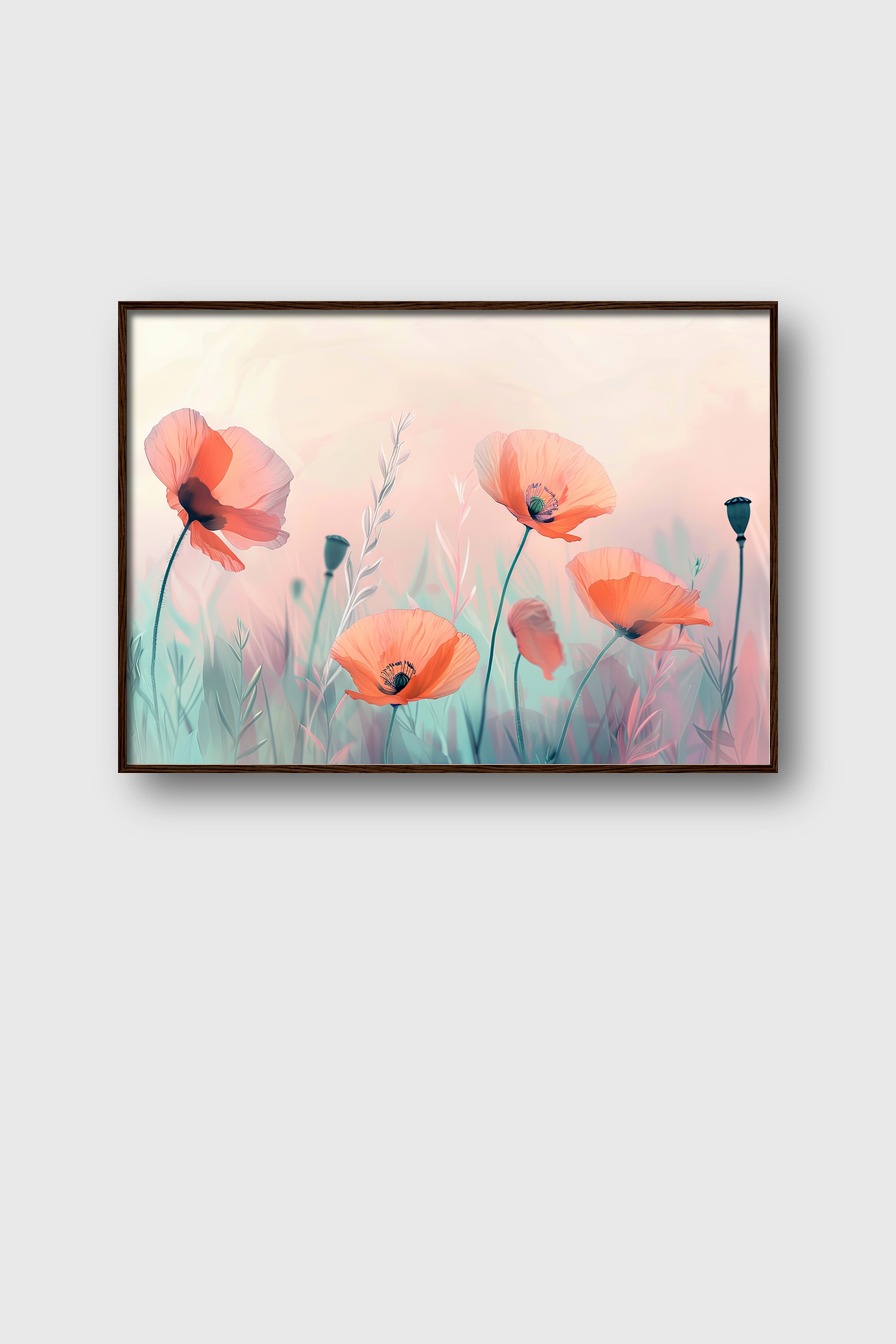 Das Motiv bringt Ruhe und Leichtigkeit in den Raum, die sanften Farben harmonieren dezent mit verschiedenen Einrichtungsstilen. Mohnblumen wirken wie ein stiller Moment, der zum Verweilen und Beobachten einlädt. Das Bild entfaltet eine natürliche Frische und Eleganz mit subtilen Farbspielen.