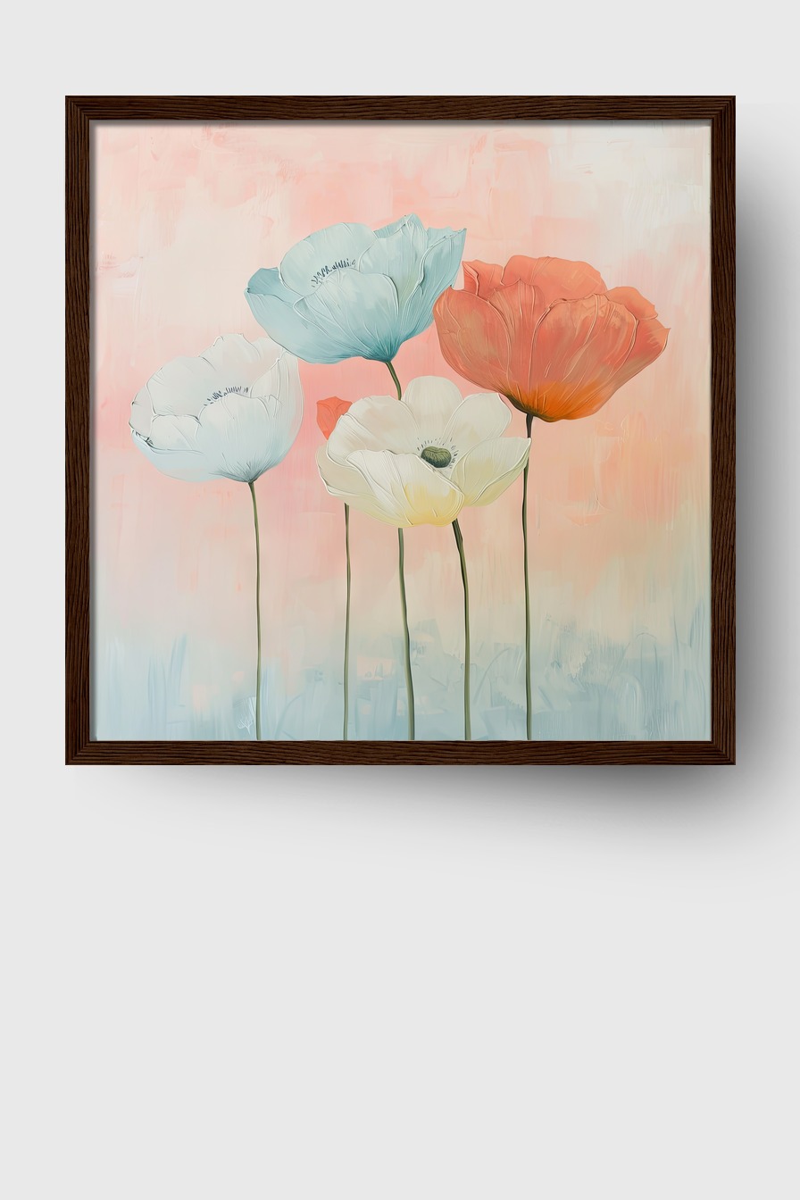 Das Bild belebt jeden Raum durch die klare Linienführung der schlanken Stiele, die zusammen mit den weichen Blütenformen für harmonische Spannung sorgen.
