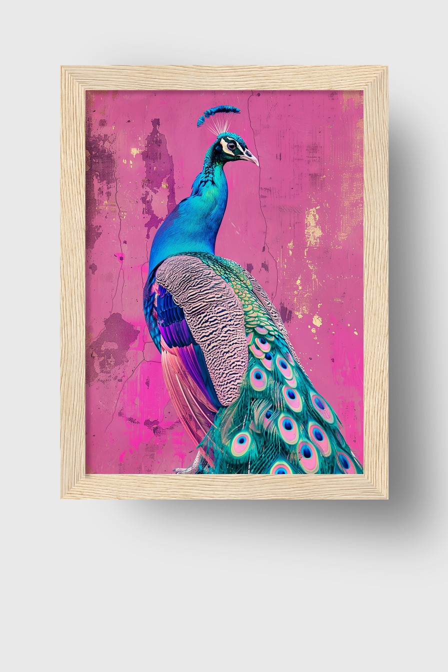 Das Poster des Pfaus (170 g/m², halbmatt) ist hinter bruchsicherem Plexiglas in einem FSC-zertifizierten Kiefernholzrahmen. Erhältlich in verschiedenen Holzfarben. Wird mit Aufhängeset fertig montiert geliefert.