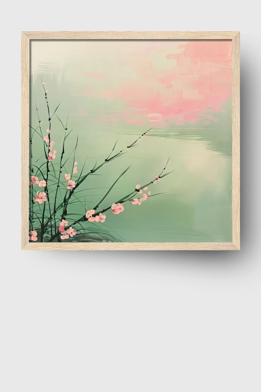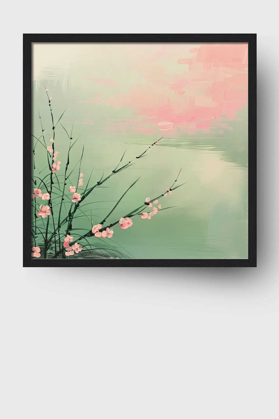 Sanft geschwungene Zweige mit leichten rosa Blüten entfalten sich an der Fläche. Das Motiv wirkt beruhigend und leicht.
