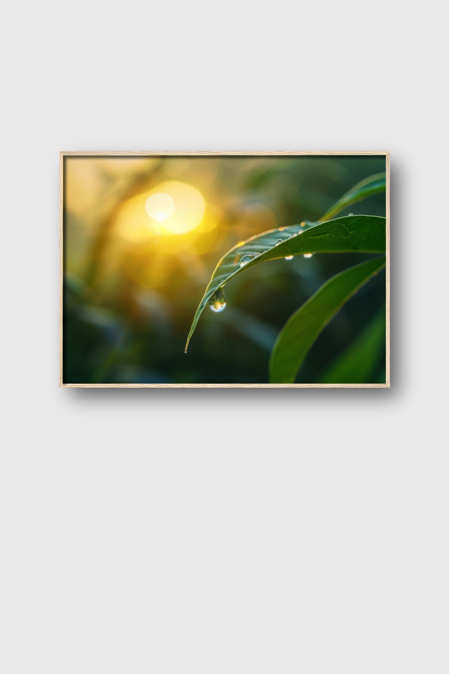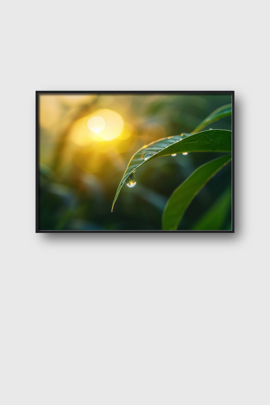 Ein einzelner Tropfen am Blatt wirkt wie ein Juwel, das die Morgensonne reflektiert und den Betrachter zum Verweilen einlädt.