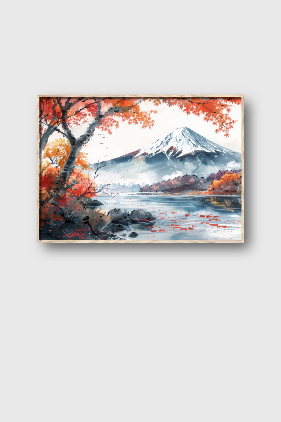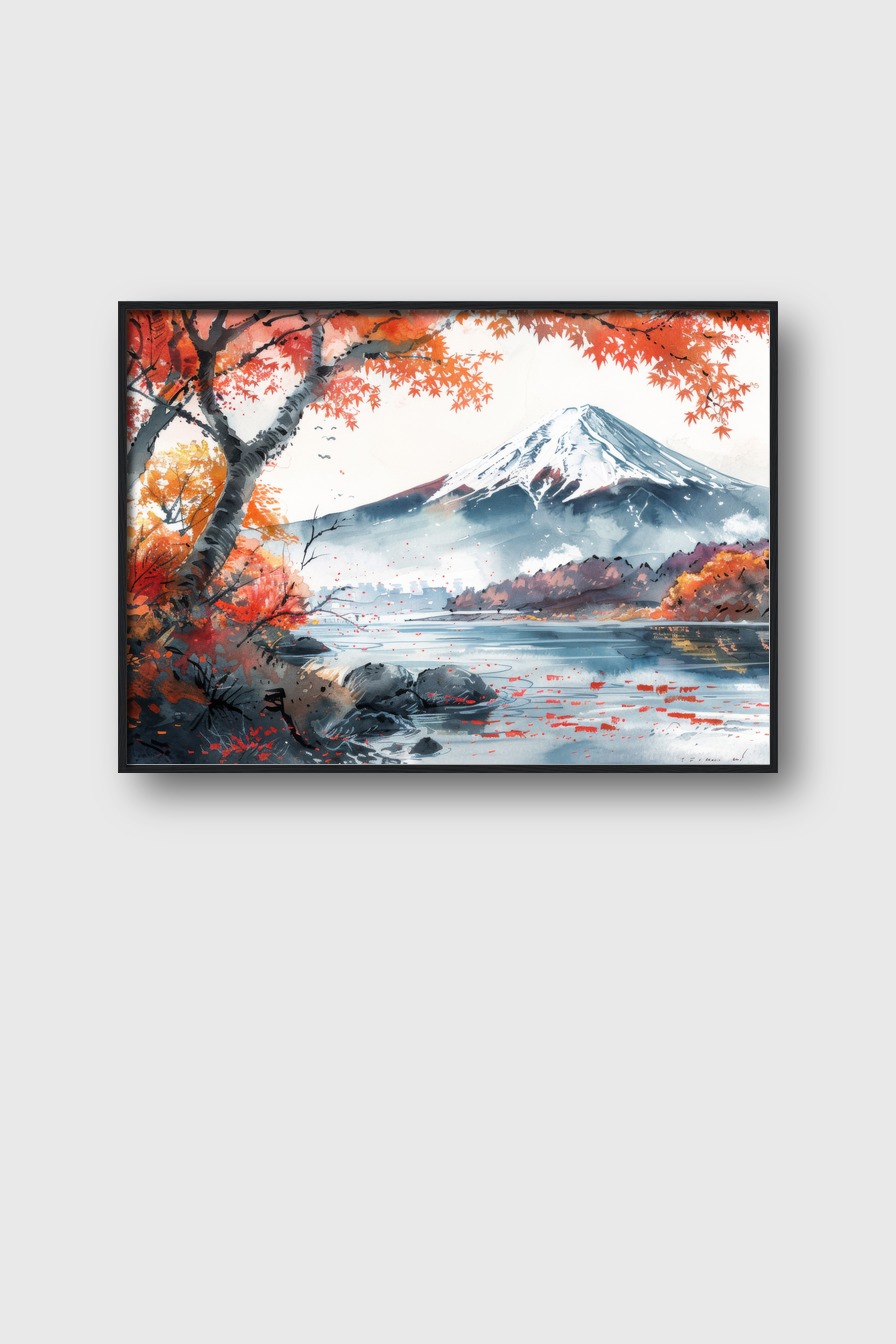 Der Bergsee mit roten und orangefarbenen Herbstblättern schafft eine klare, kühle Atmosphäre im Raum.