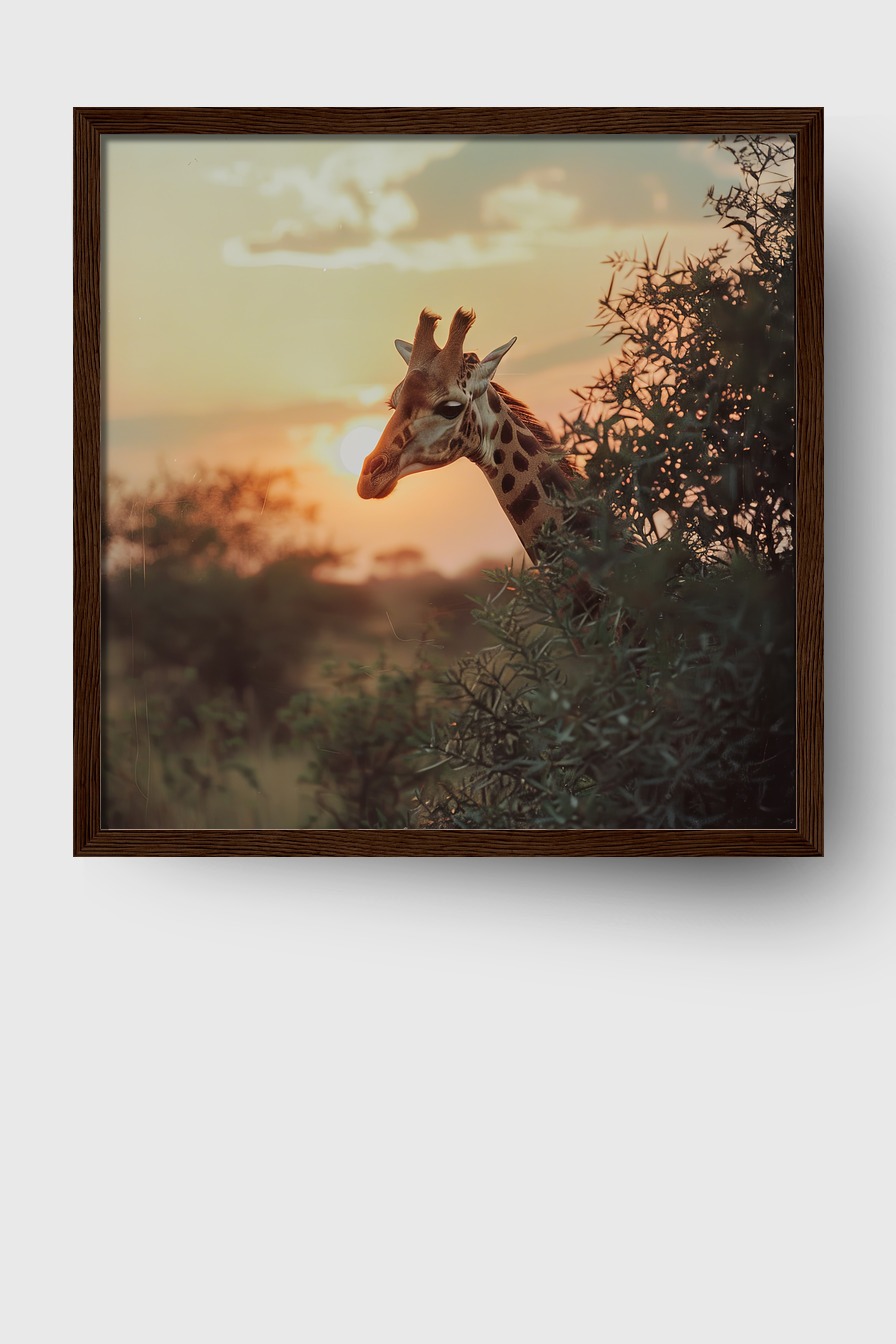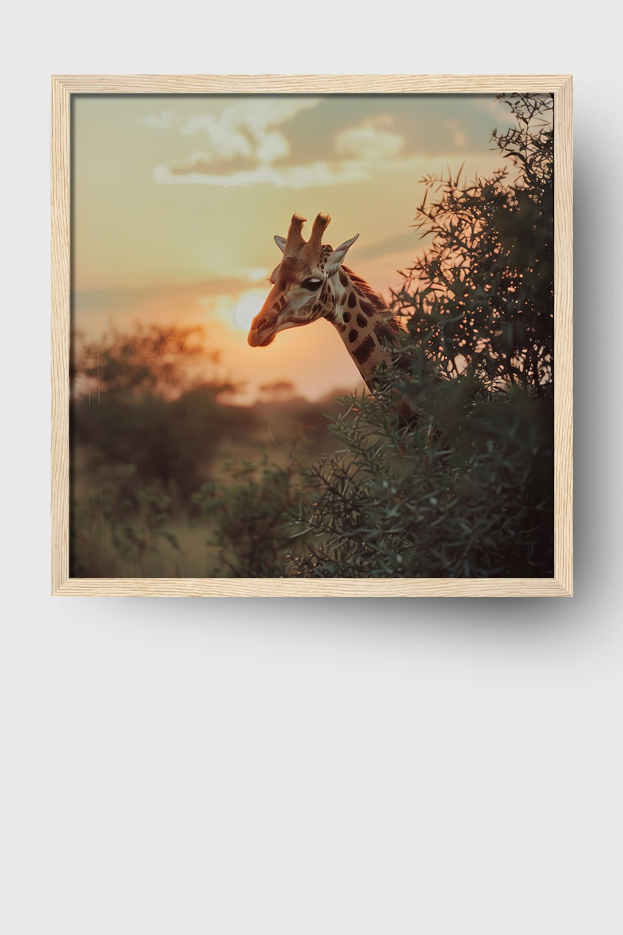 Der Kopf der Giraffe leuchtet warm im Licht der untergehenden Sonne. Auf halbmattem 170 g/m² FSC-Papier hinter klarem Plexiglas in einem Kiefernholzrahmen (FSC-zertifiziert). Fertig zum Aufhängen inklusive Set.