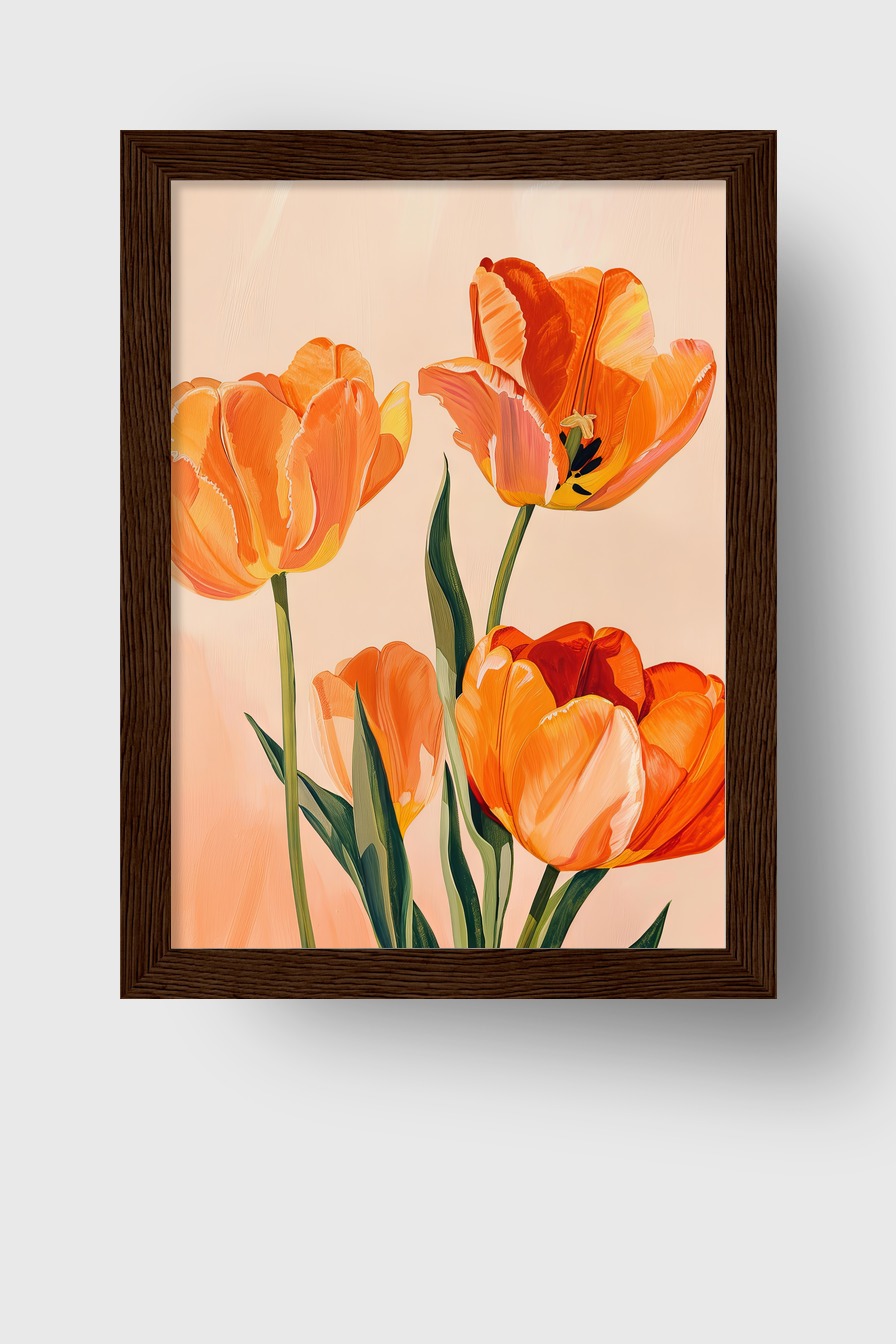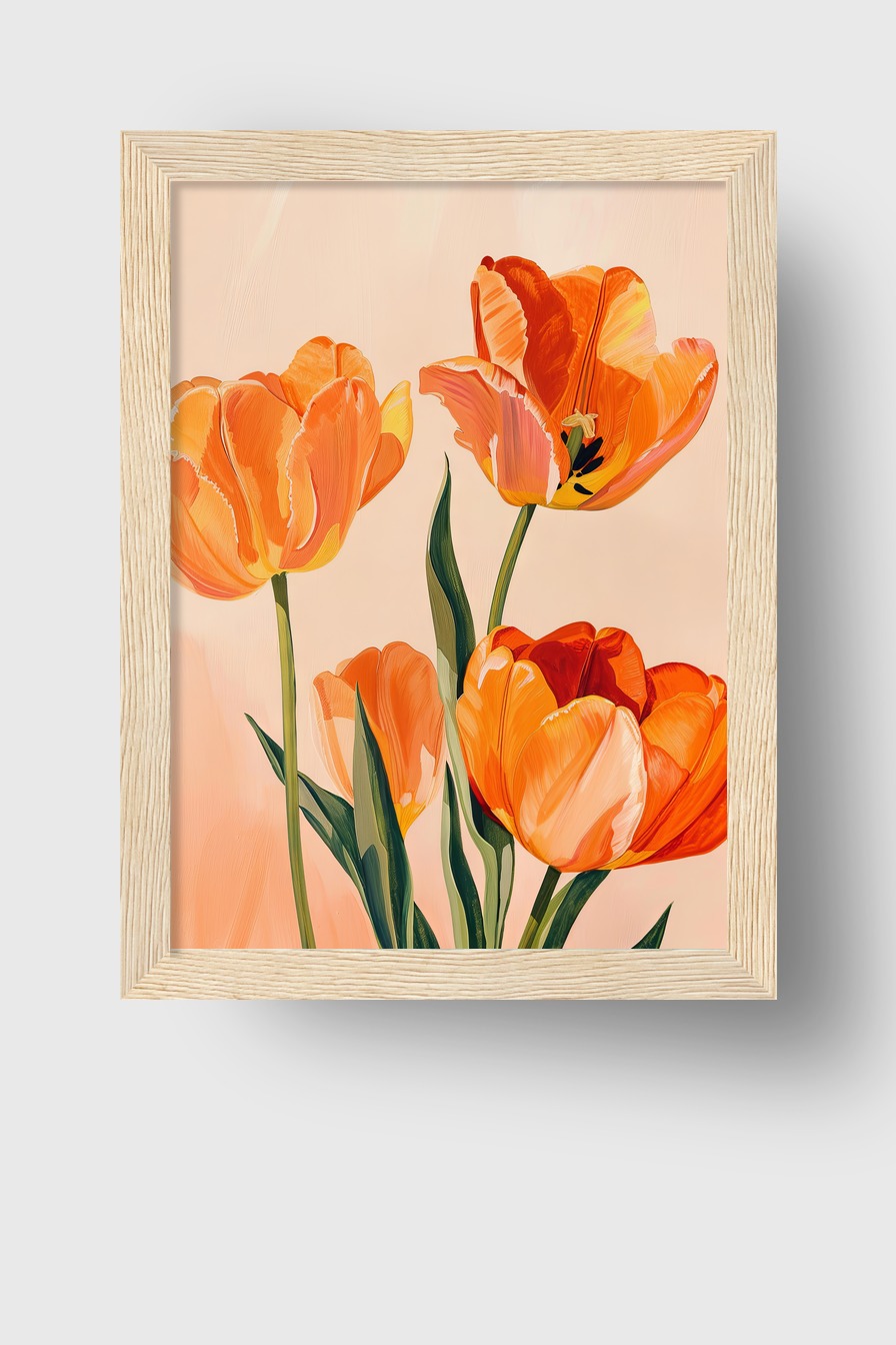 Im Raum wirkt das Bild ruhig und zugleich lebendig, die Tulpen scheinen fast zu wachsen und füllen die Ecke sanft mit frischem Frühling. Die Komposition strahlt Wärme aus, ohne aufdringlich zu sein.