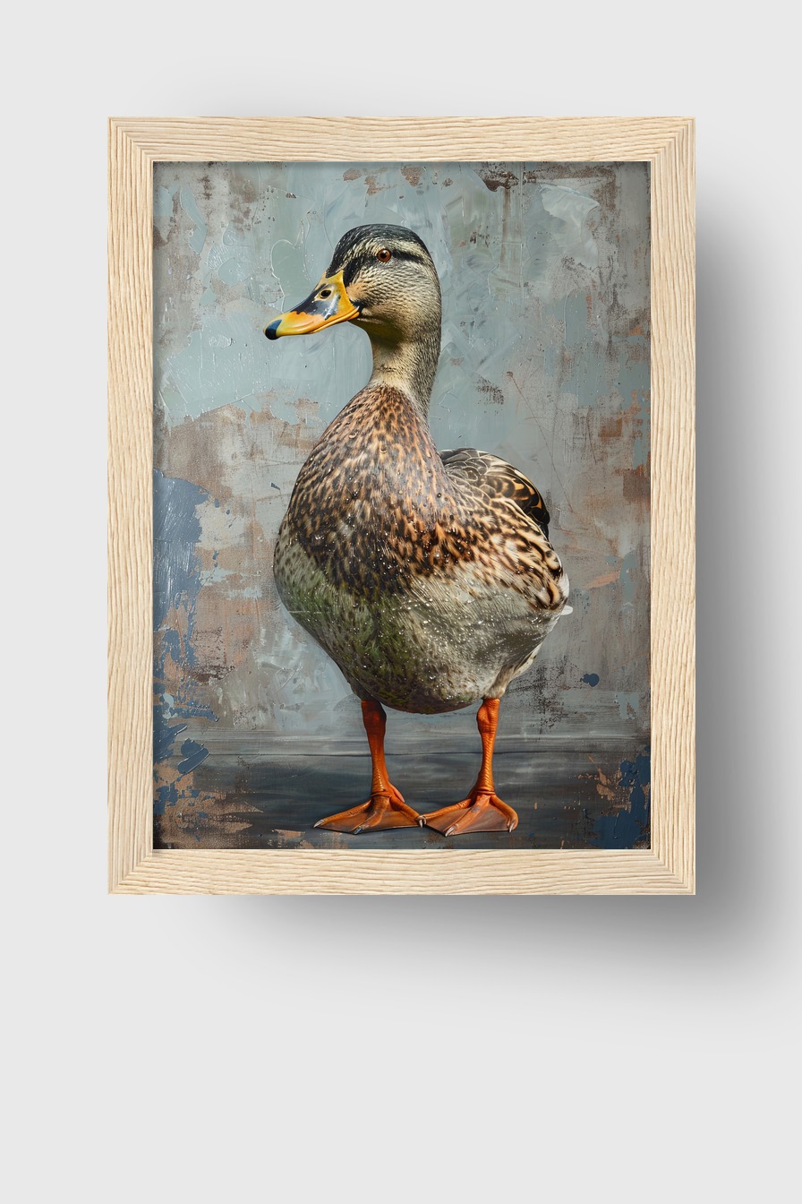Stockente vor strukturierter Fläche als Fotografie. Poster 170 g/m² hinter bruchsicherem Plexiglas im Kiefernholzrahmen. Komplett mit Aufhängeset, bereit zum Aufhängen.