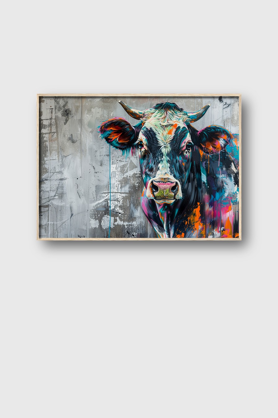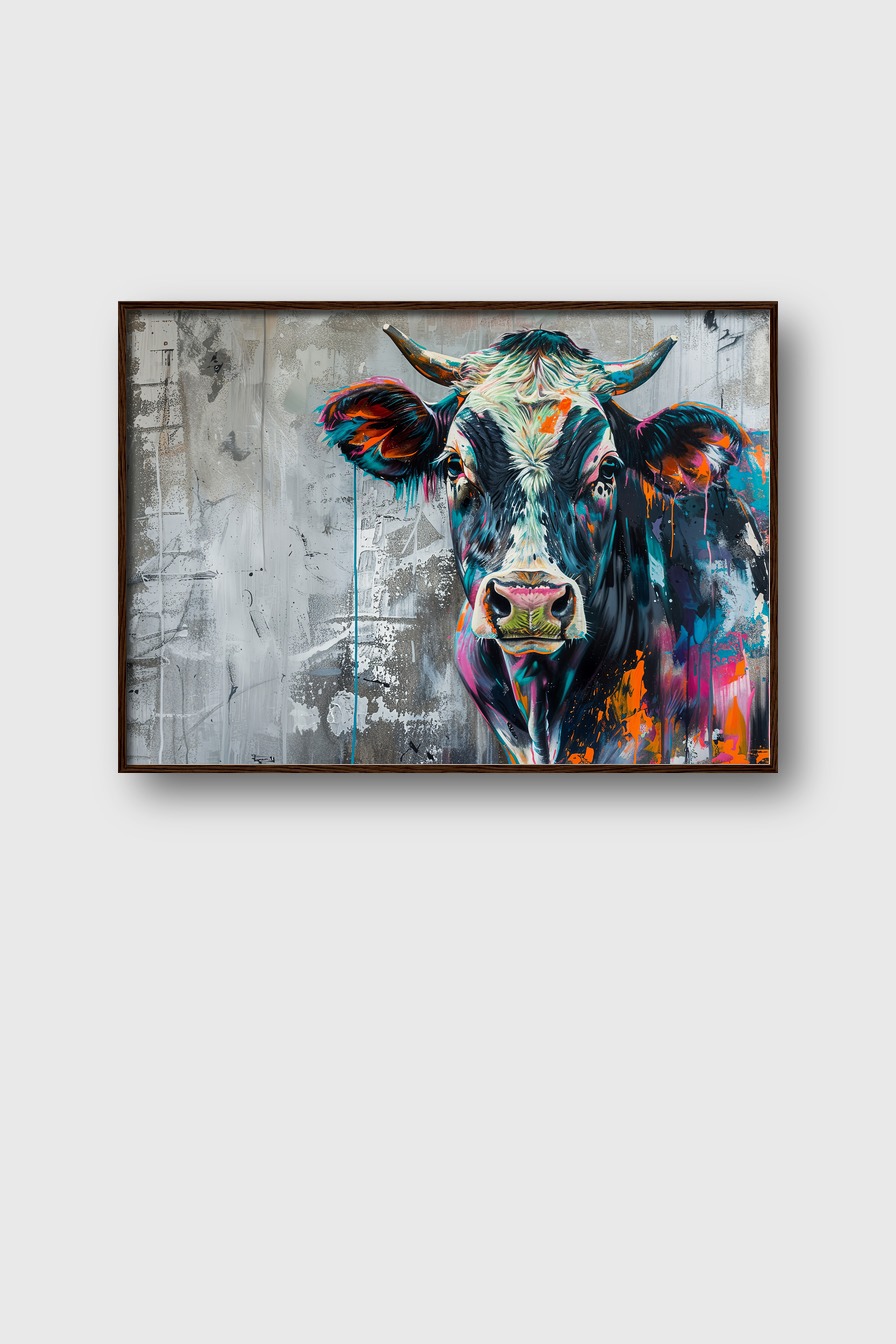 Bunt gemaltes Kuhportrait als Poster (170 g/m², halbmatt) hinter bruchsicherem Plexiglas in Kiefernholzrahmen (FSC-zertifiziert). Fertig zum Aufhängen, inklusive Aufhängeset.
