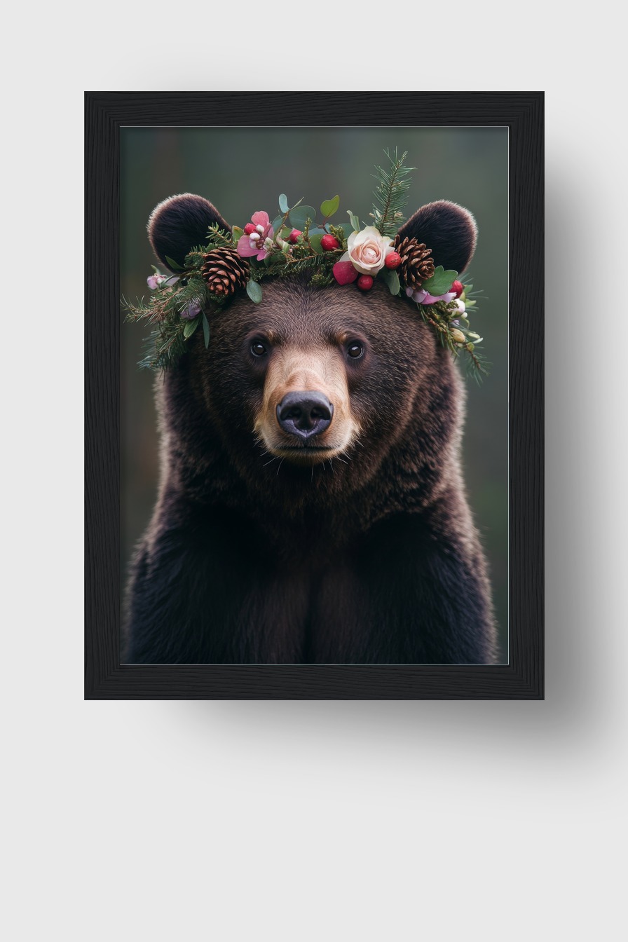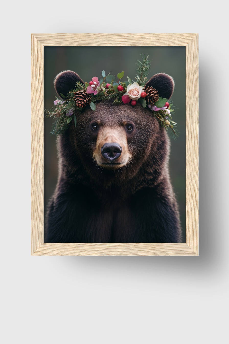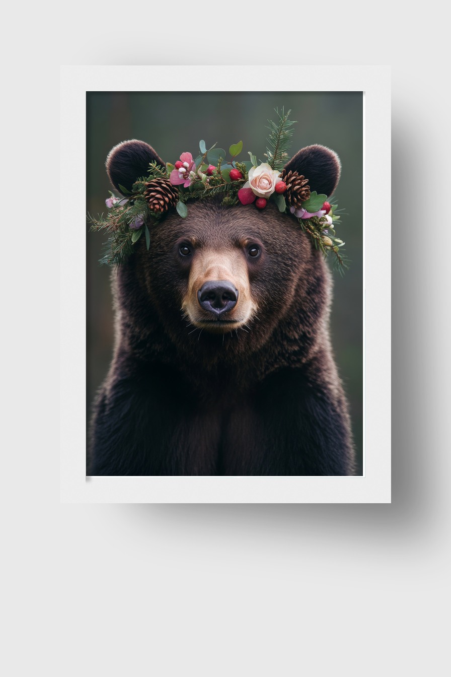 Ein Braunbär trägt einen Kranz aus Tannenzapfen, Blüten und grünen Ästen. Das Portrait hebt die ruhigen, klaren Augen des Bären hervor.