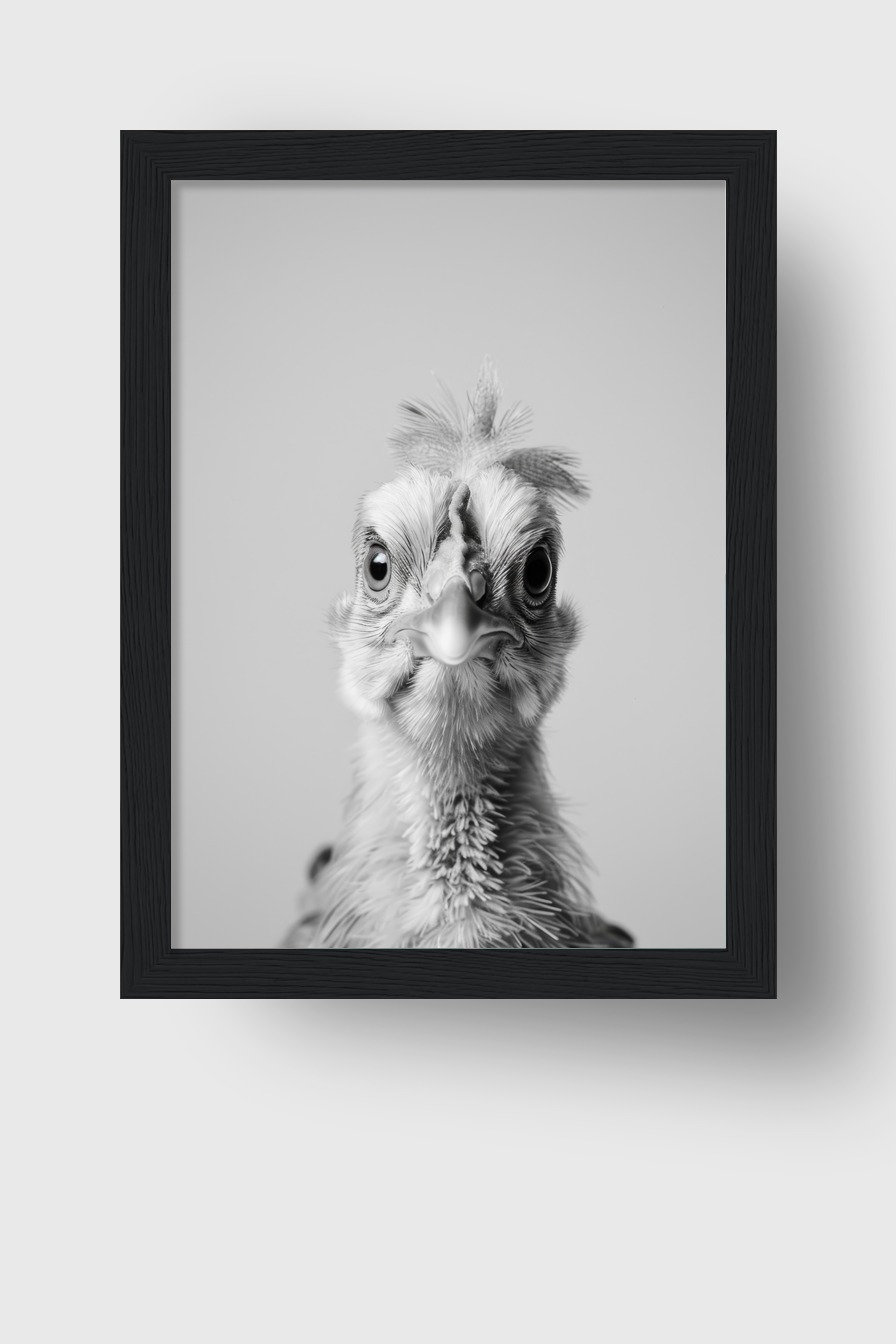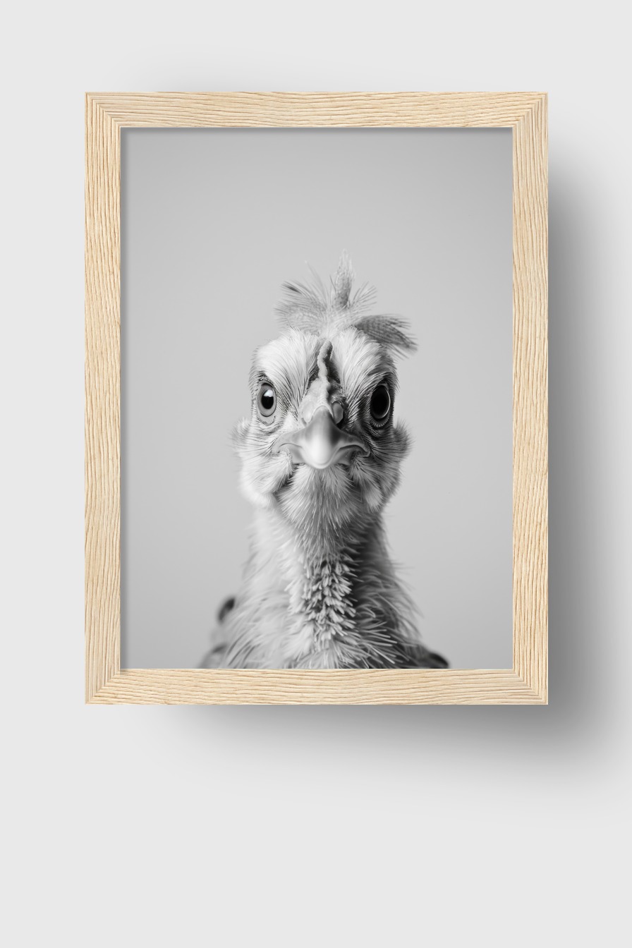 Das Huhn zieht mit seinen großen Augen und der klaren Kontur alle Blicke auf sich. Im Raum erzeugt es eine zurückhaltende, aber präsente Stimmung, die genaues Hinschauen fordert.