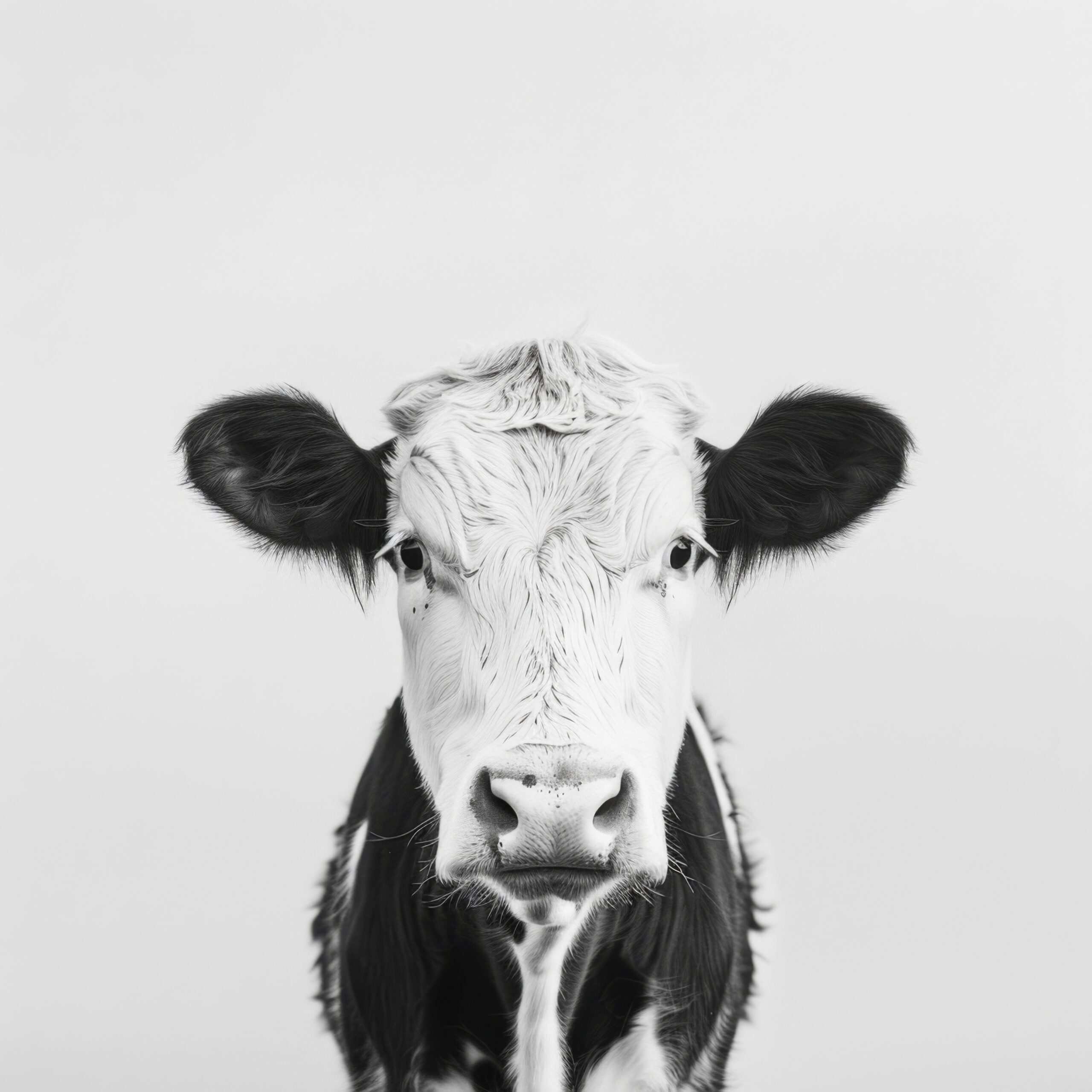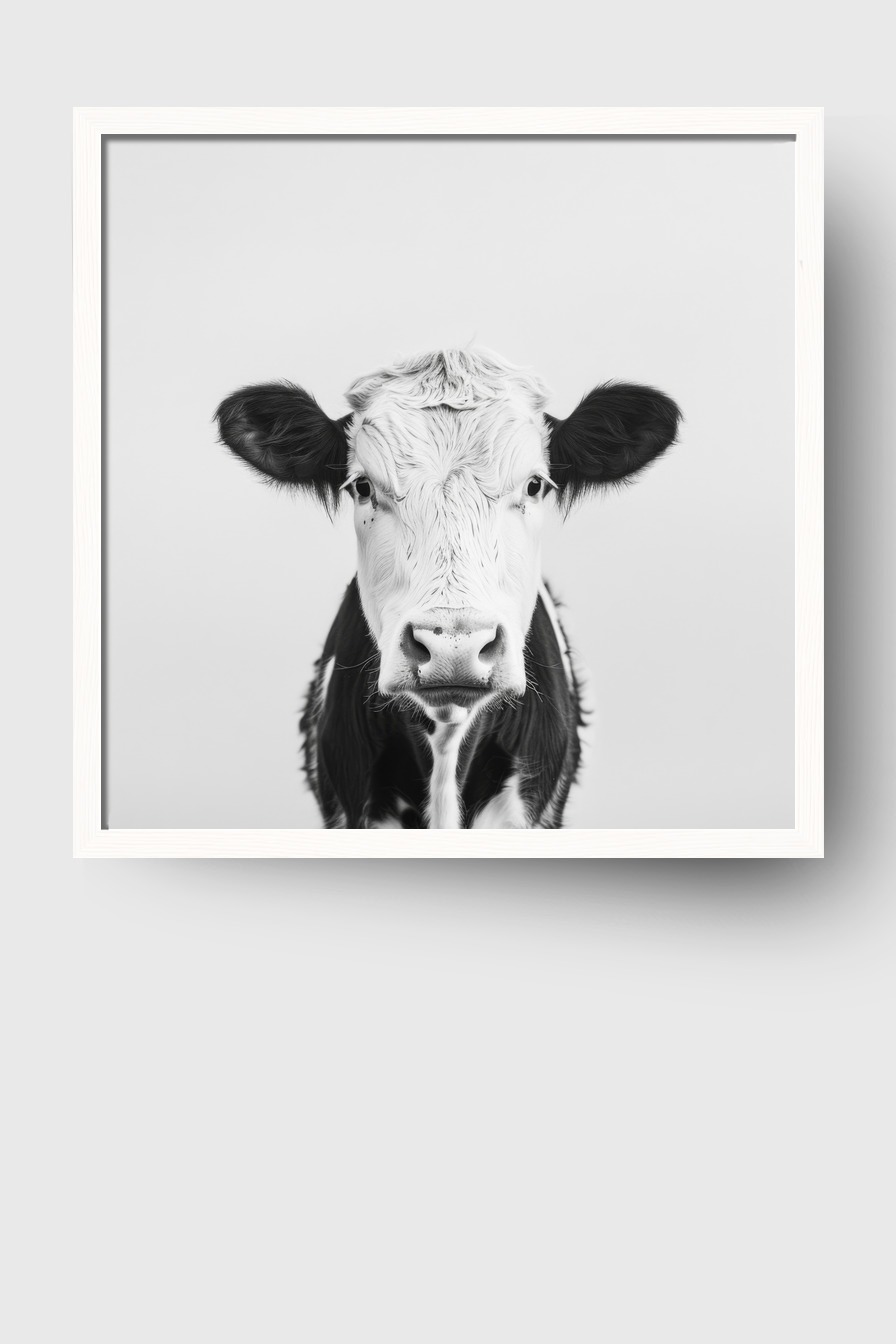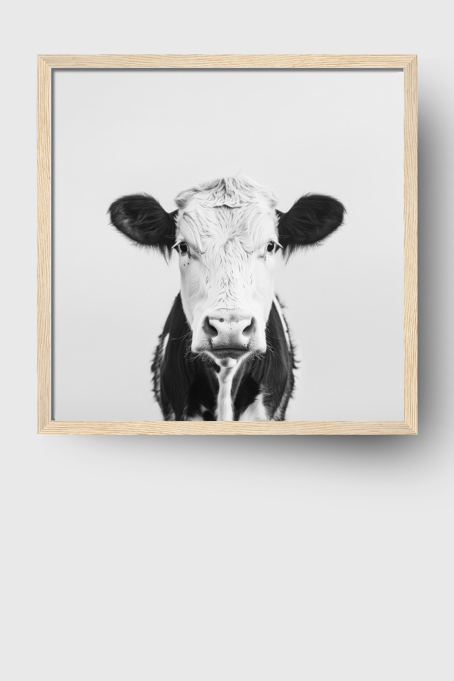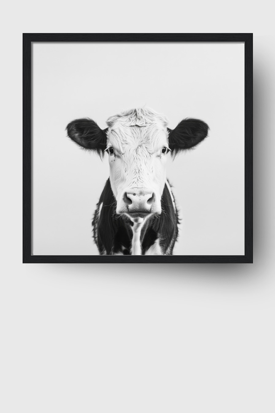 Im Raum erzeugt die klare, kontrastreiche Darstellung eine eindringliche Atmosphäre, die durch die reduzierte Farbpalette den Fokus ganz auf das Gesicht der Kuh lenkt.