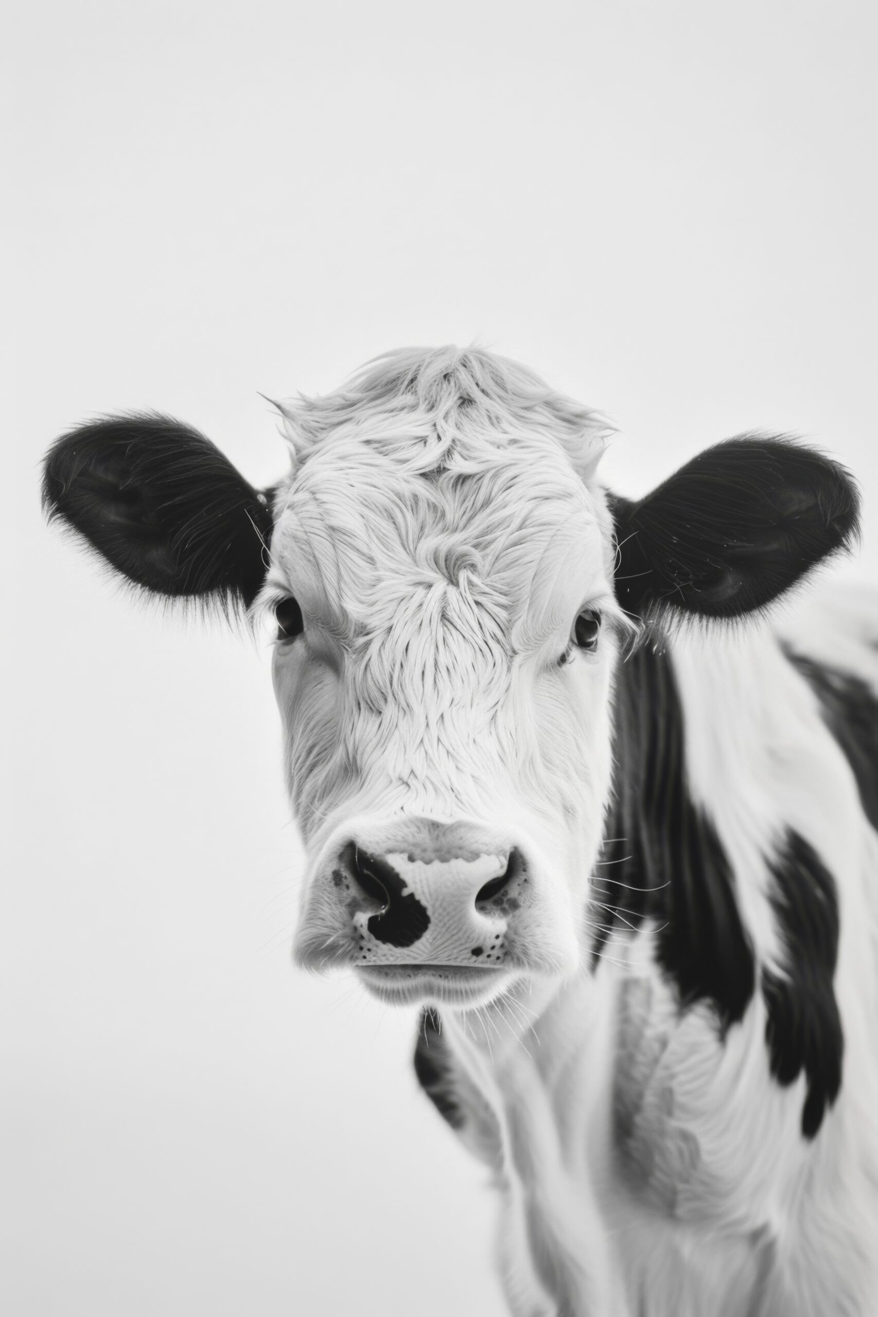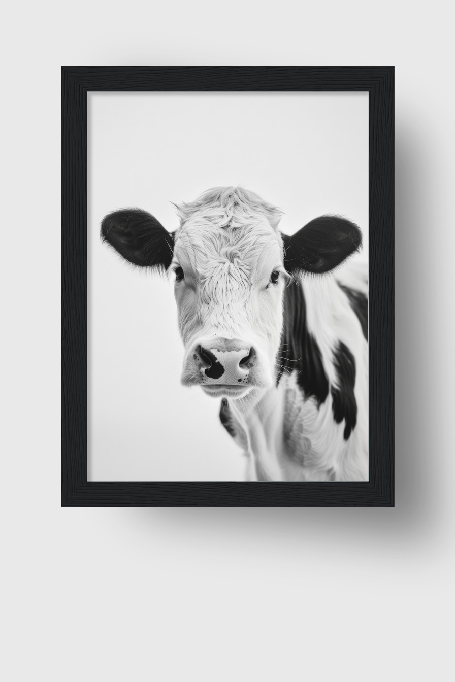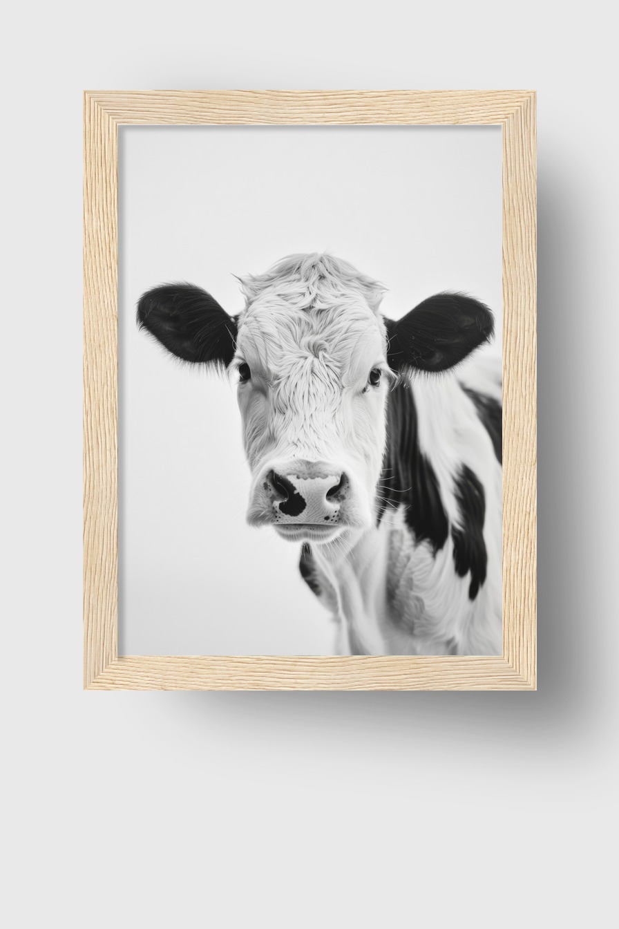 Im Raum zieht die Kuh frontal die Aufmerksamkeit auf sich durch die direkte Haltung und den intensiven Augenblick. Die Schwarz-Weiß-Tönung passt gut zu klaren, minimalistischen Einrichtungsstilen. Ein Motiv, das den Raum eigenständig prägt.