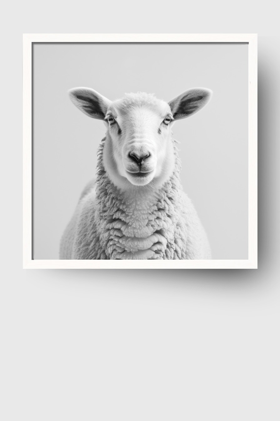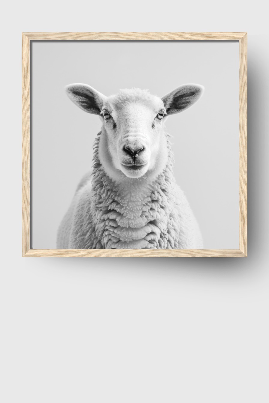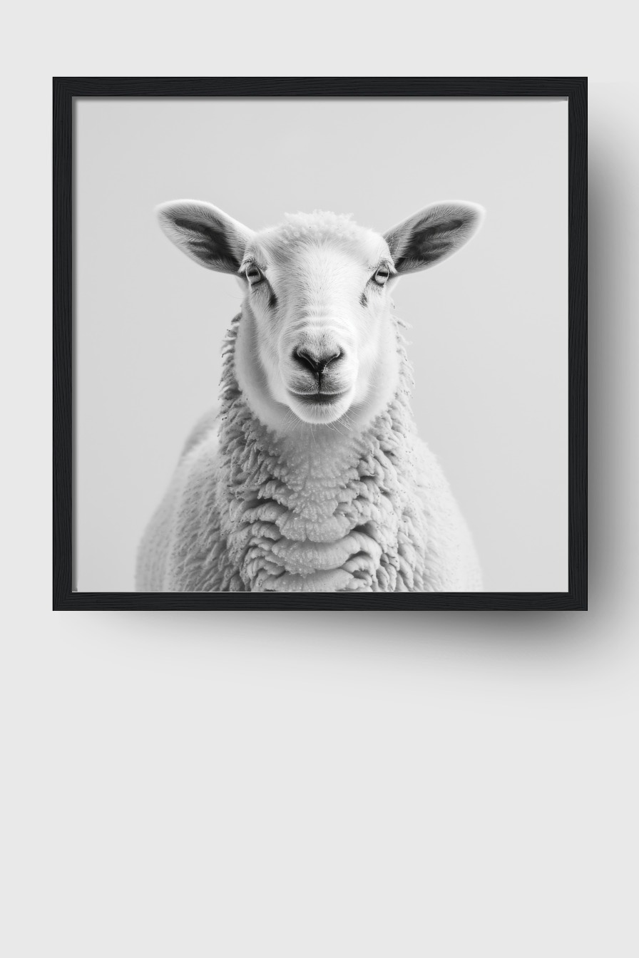 Im Rahmen erzeugt das Motiv eine konzentrierte Atmosphäre. Der klare Blick und die einheitliche Helligkeit lassen das Schaf fast lebendig erscheinen. Die kontrastreichen Schatten betonen die Form.