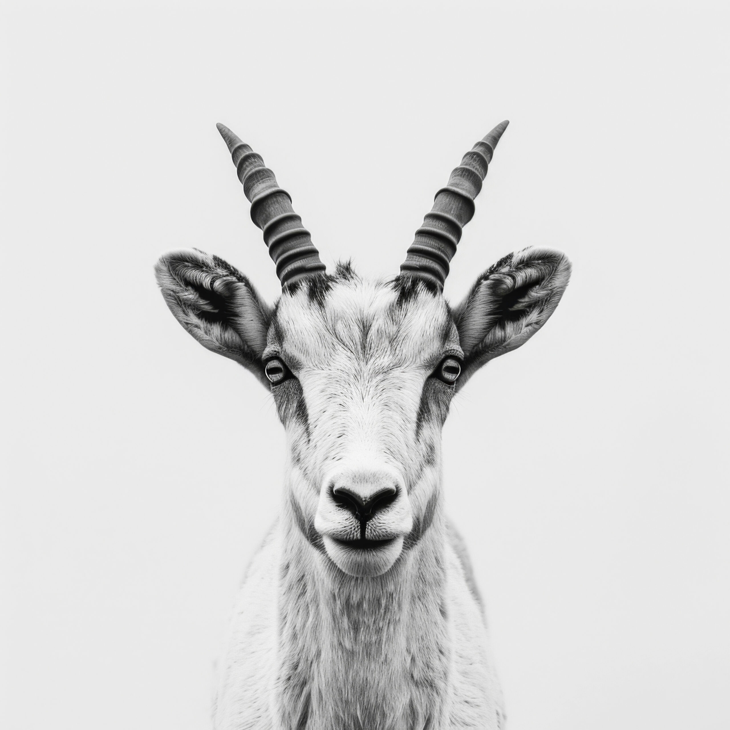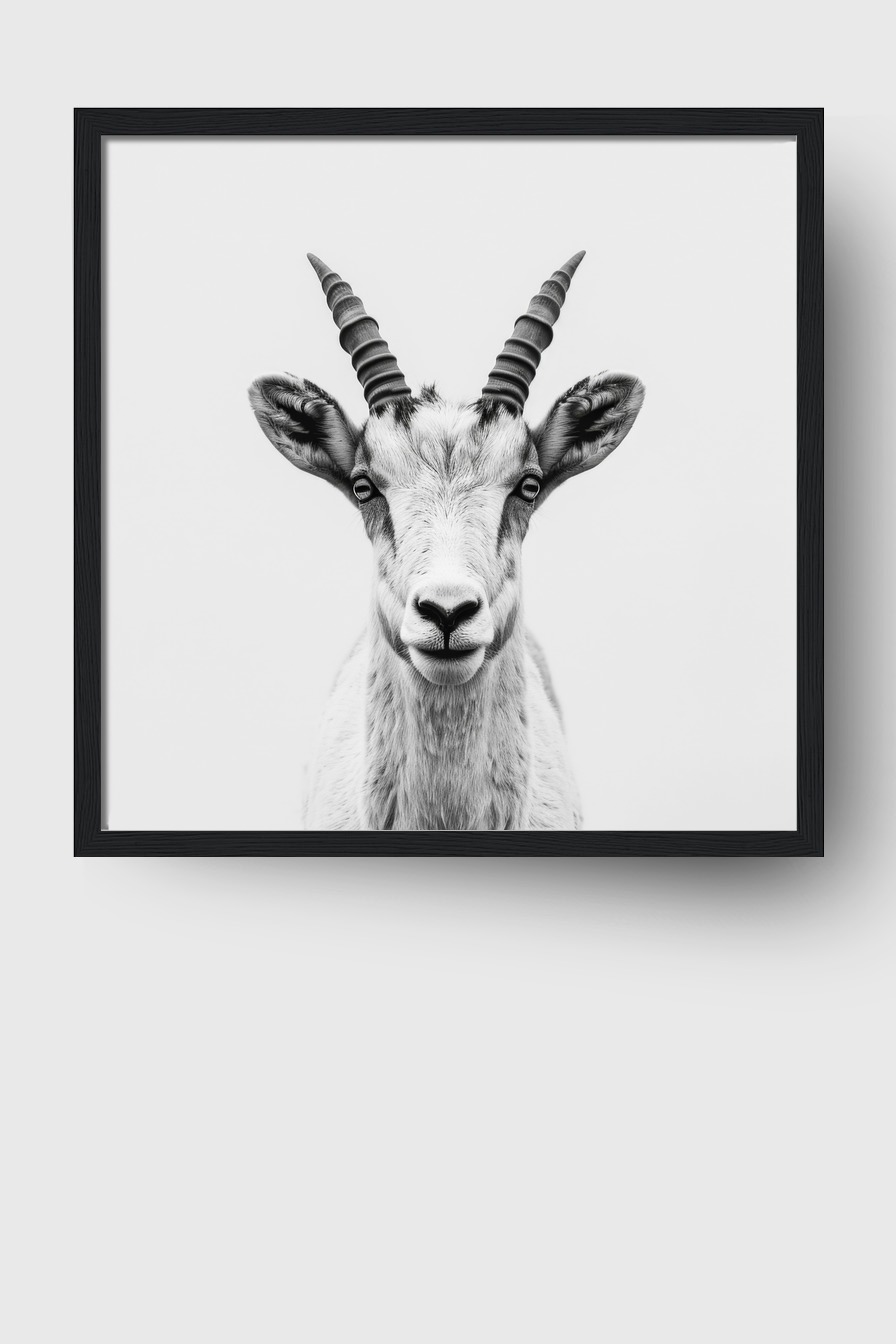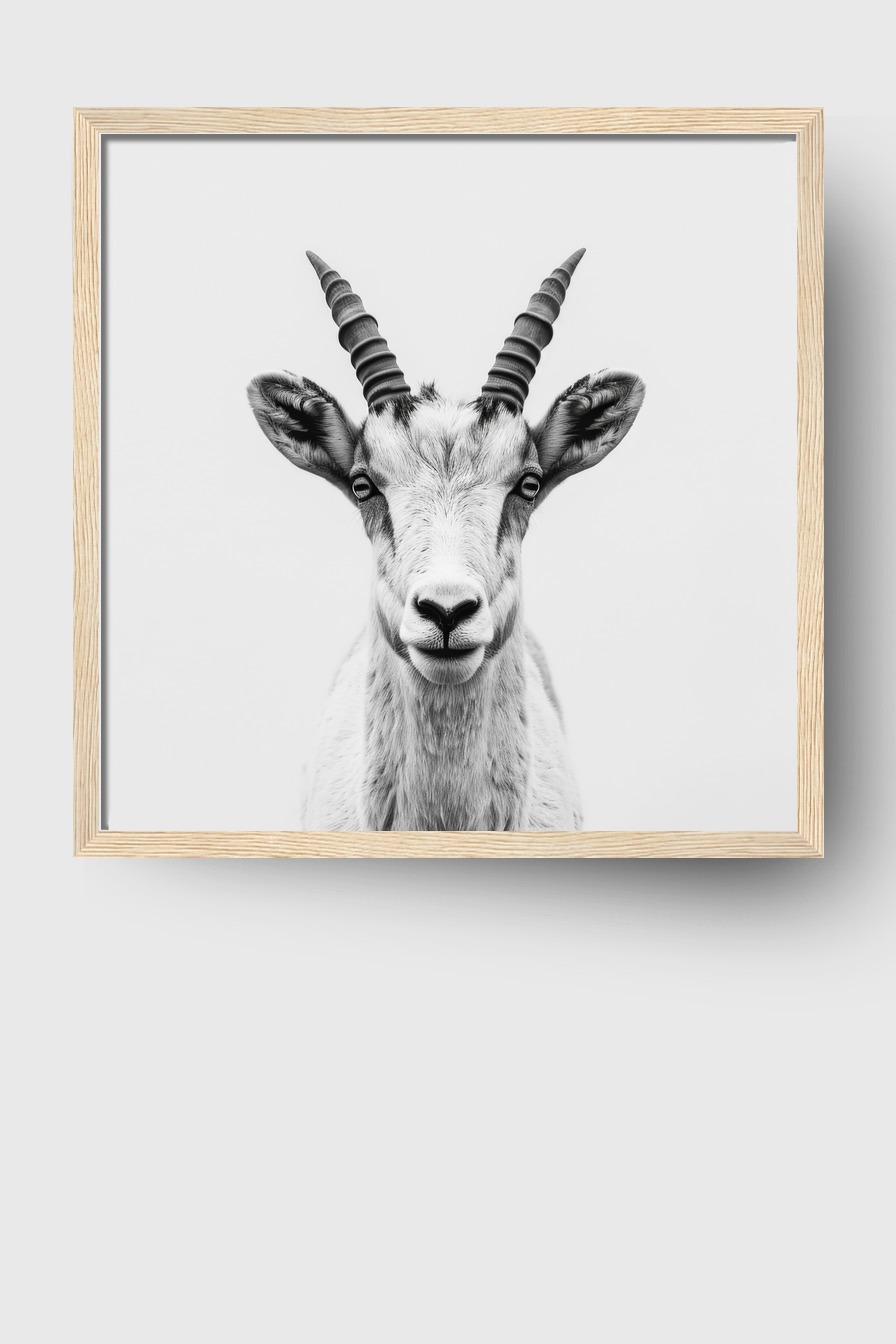 Hängt im Raum wirkt das klare, fokussierte Porträt wie ein eindrucksvolles Statement. Die Ruhe des Hintergrunds lässt jedes Detail der Ziege hervortreten und schafft Spannung und Präsenz.