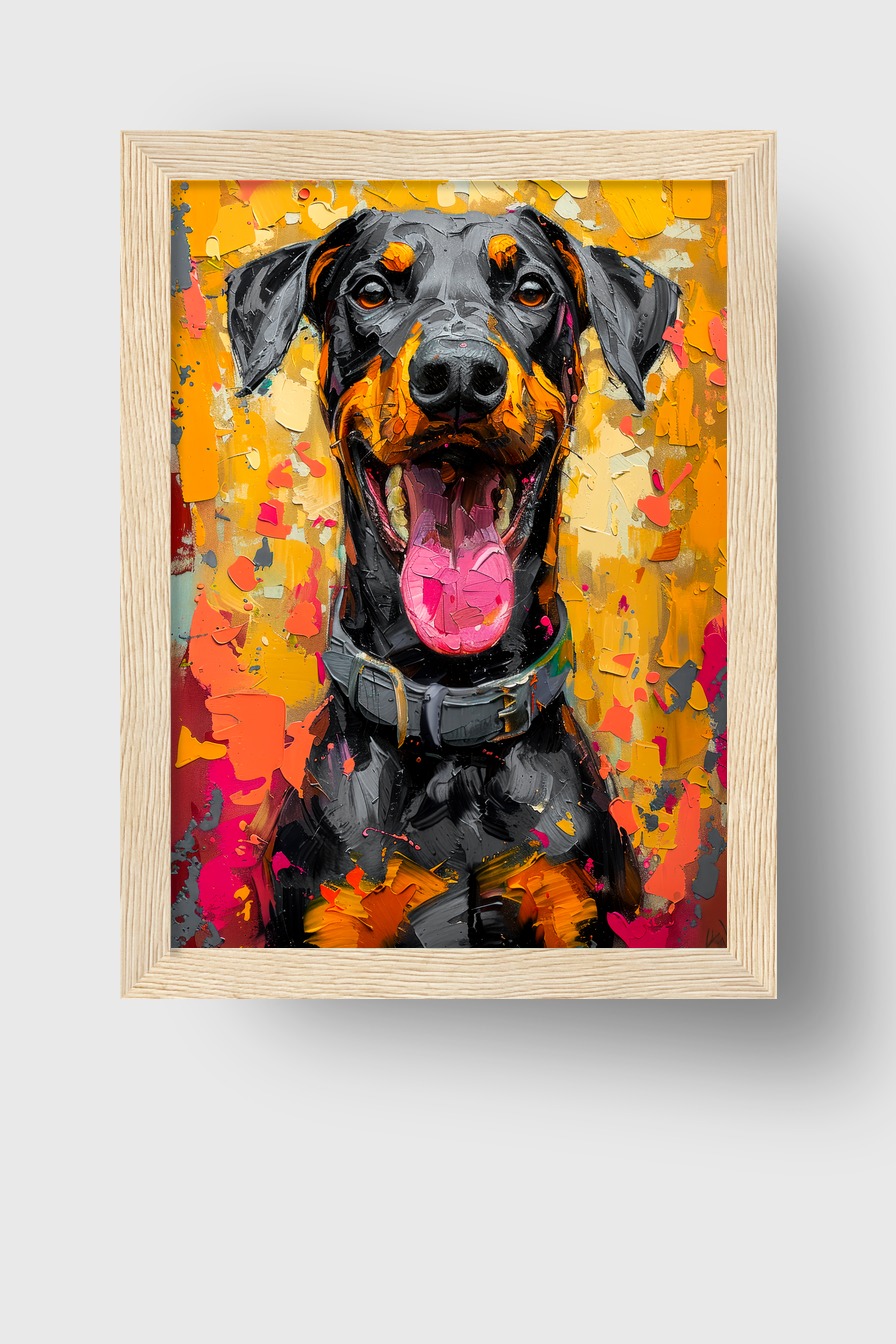 Dobermann als Poster (170 g/m², halbmatt) hinter bruchsicherem Plexiglas in Kiefernholzrahmen (FSC). Farben intensiv und klar. Fertig zum Aufhängen inklusive Montage.
