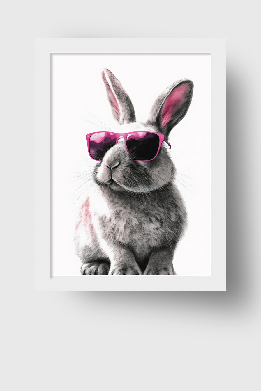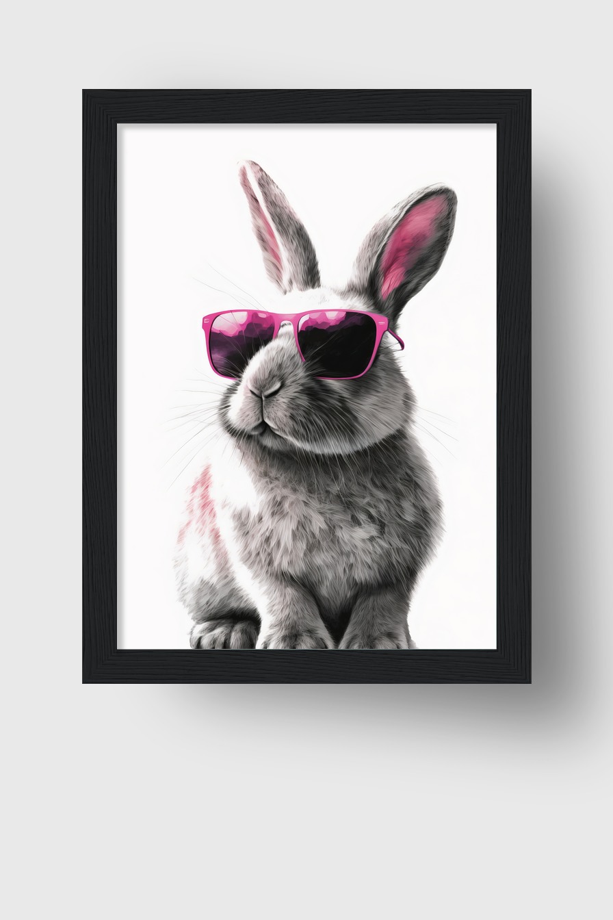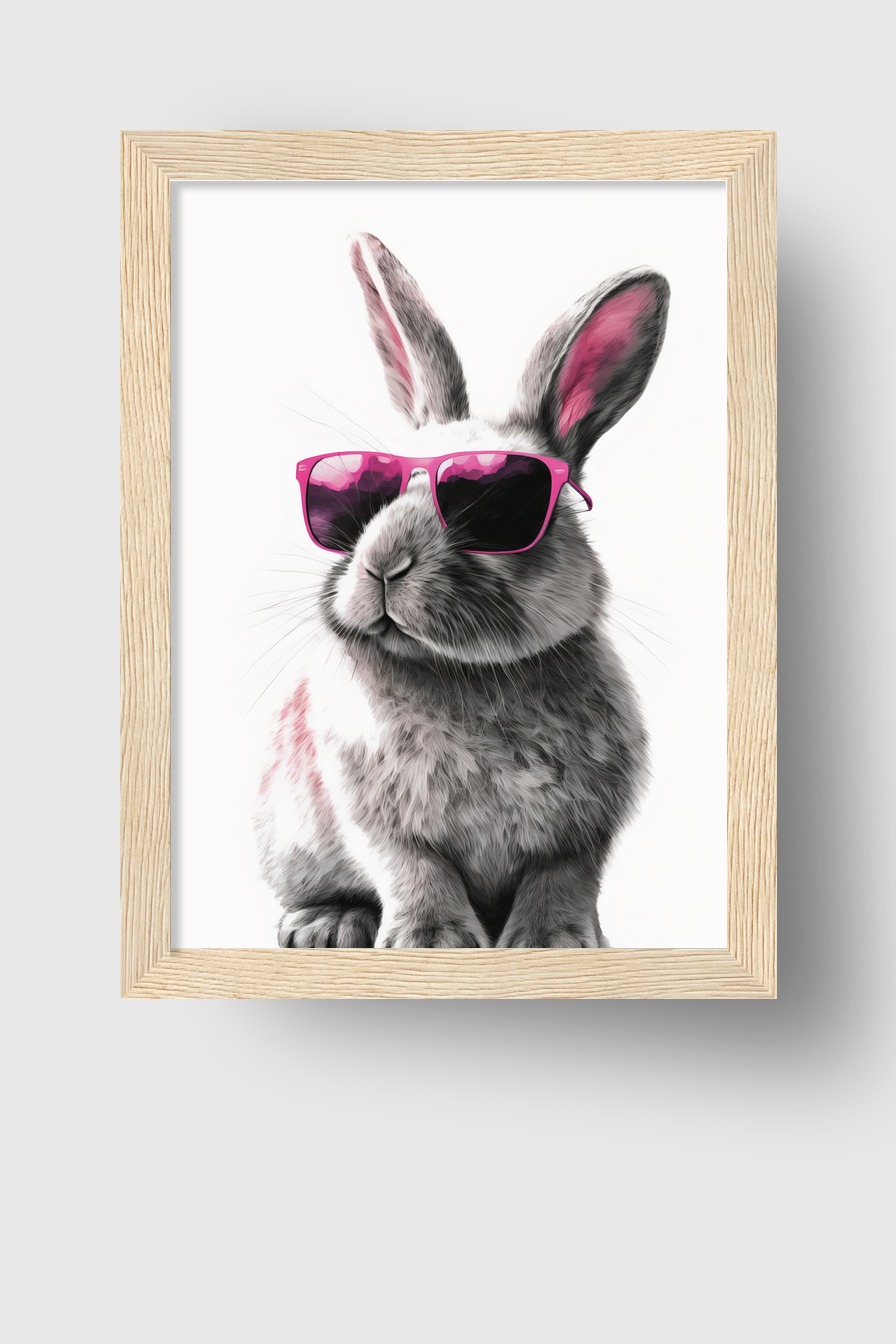 Ein Kaninchen mit pinker Sonnenbrille auf halbmattem Posterpapier (170 g/m²) hinter bruchsicherem Plexiglas in Kiefernholzrahmen (FSC-zertifiziert). Rahmenfarben Schwarz, Weiß, Naturholz und Dunkelbraun verfügbar. Fertig zum Aufhängen inklusive Aufhängeset.