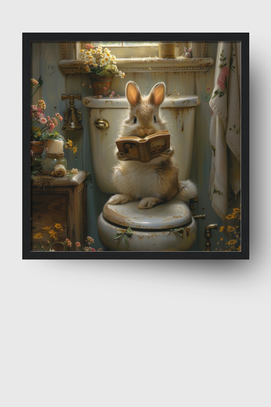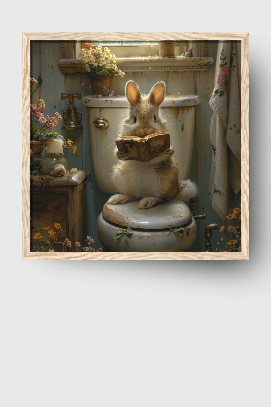 Poster auf 170 g/m² halbmattem Papier hinter bruchsicherem Plexiglas in einem Kiefernholzrahmen (FSC-zertifiziert). Das Bild zeigt ein lesendes Kaninchen auf Toilette. Fertig zum Aufhängen mit Aufhängeset.
