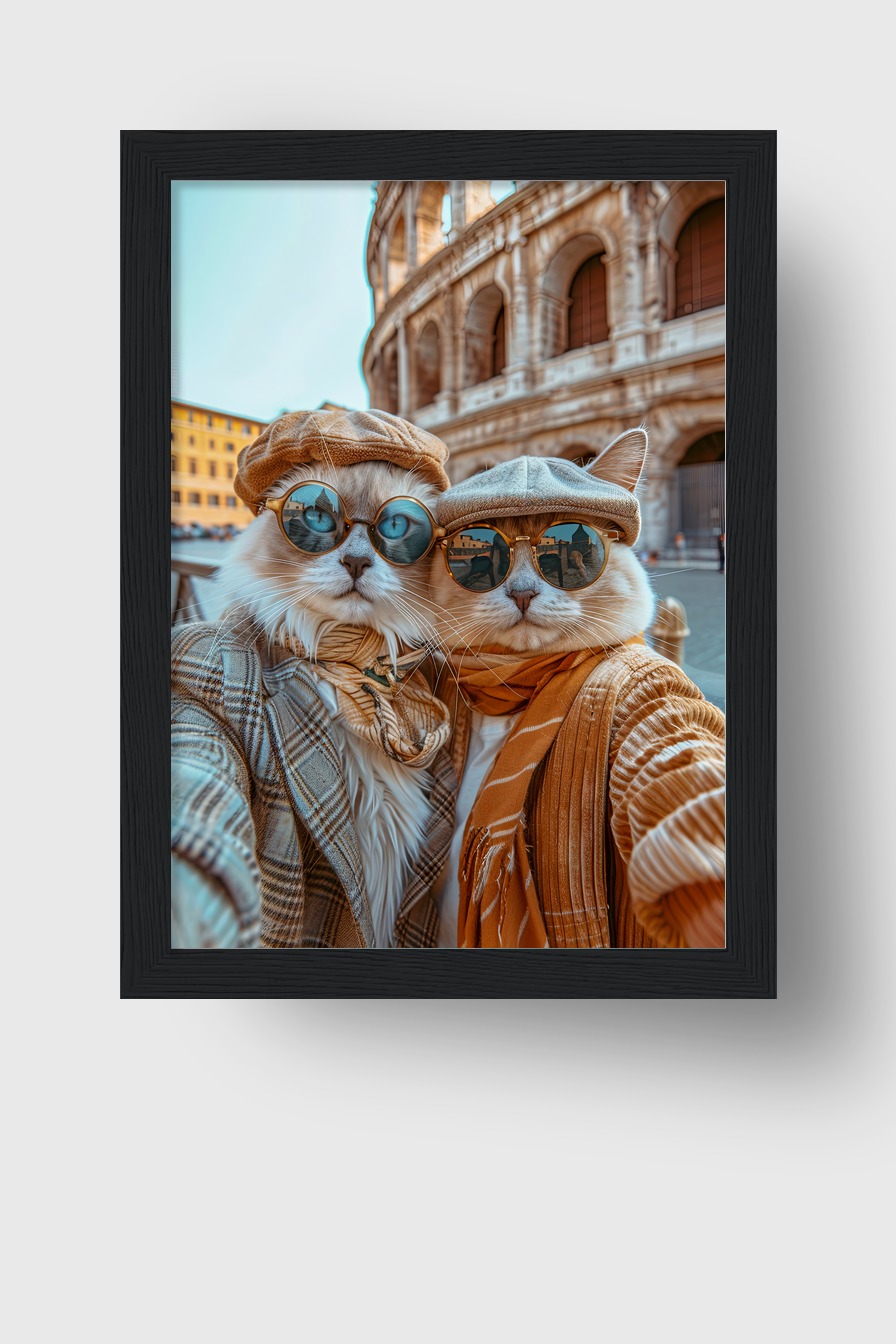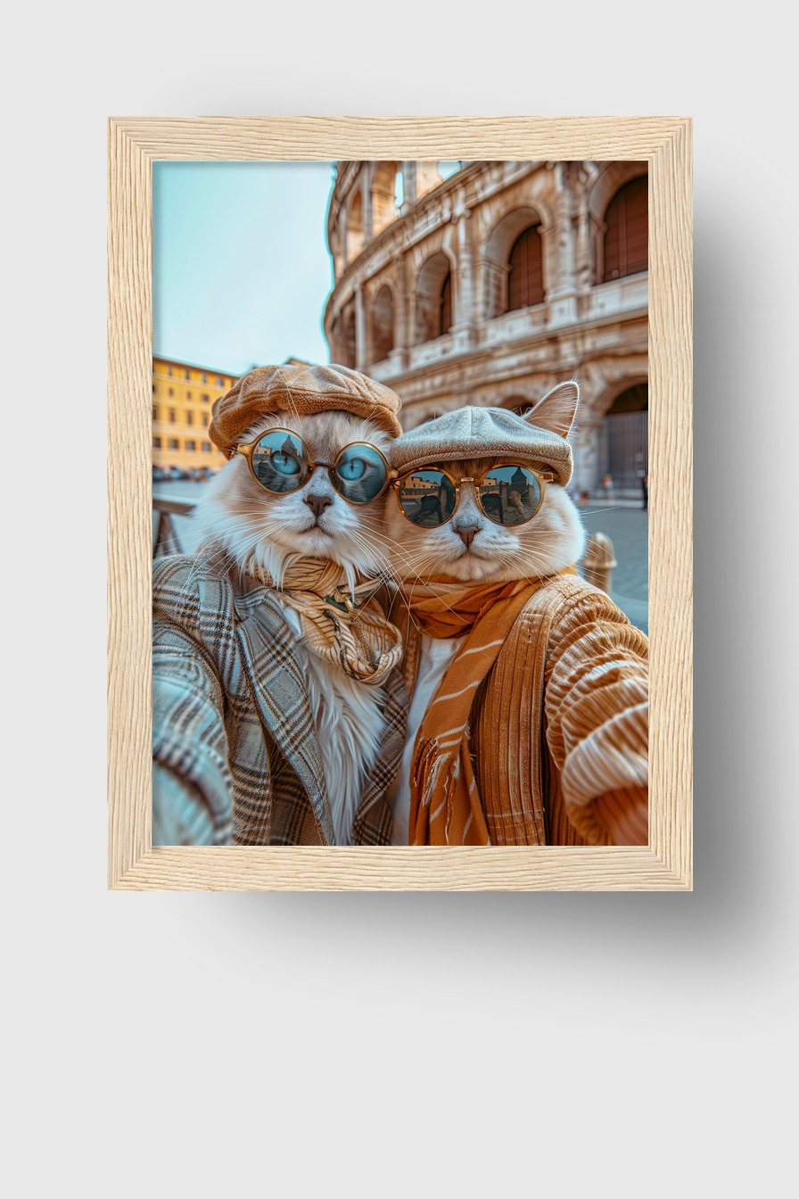 Zwei Katzen mit Hüten und Sonnenbrillen vor Kolosseum. Poster (170 g/m², halbmatt) hinter bruchsicherem Plexiglas in Kiefernholzrahmen (FSC-zertifiziert). Erhältlich in Schwarz, Weiß, Naturholz und Dunkelbraun. Fertig zum Aufhängen inklusive Aufhängeset.