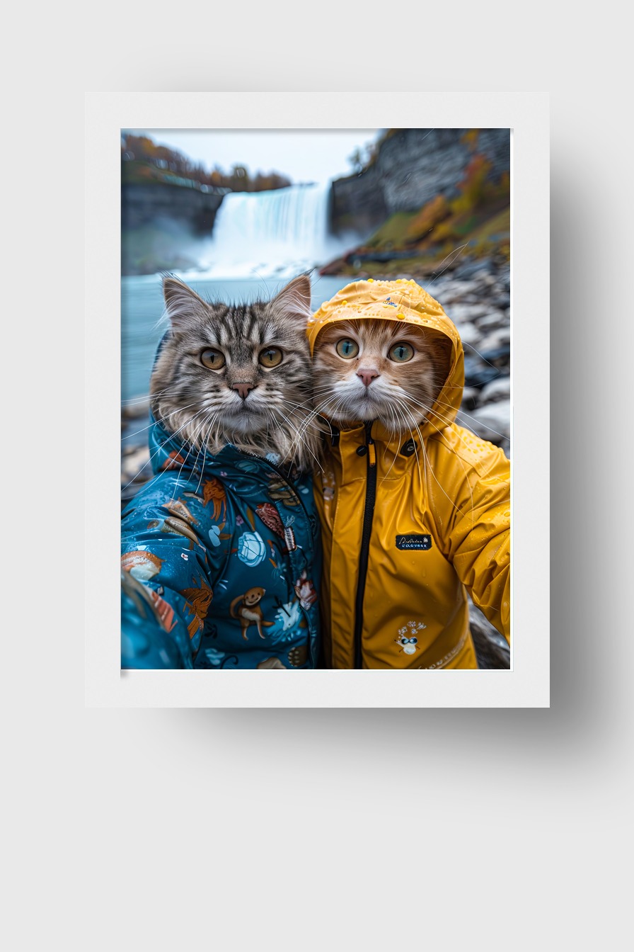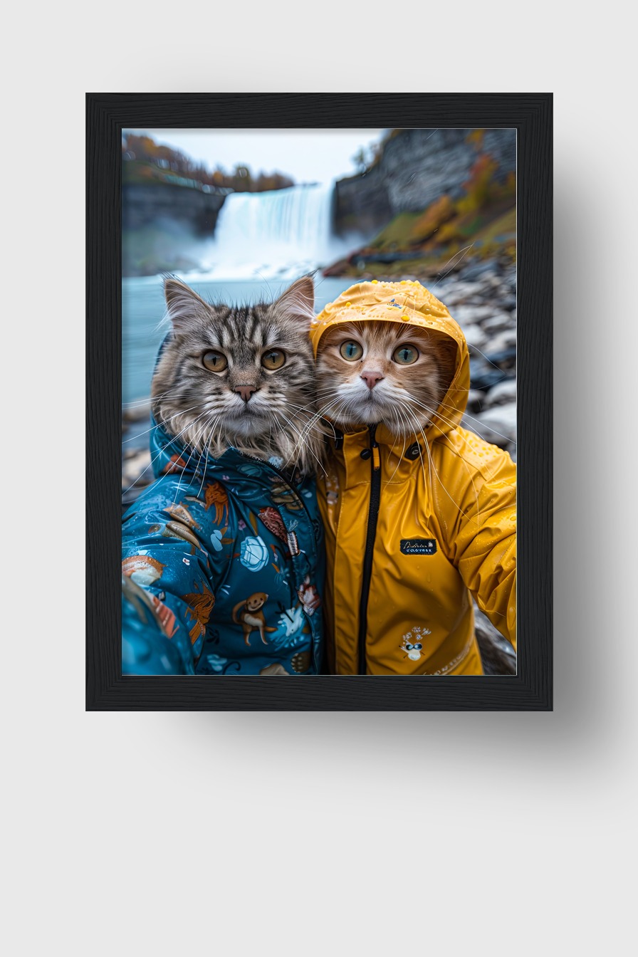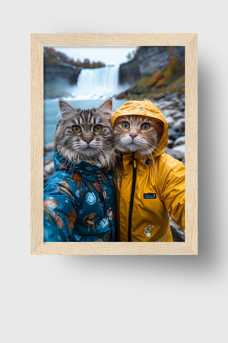 Poster mit Katzen in Regenjacken auf 170 g/m² halbmattem Papier hinter bruchsicherem Plexiglas in FSC-zertifiziertem Kiefernholzrahmen. Fertig zum Aufhängen mit Set.