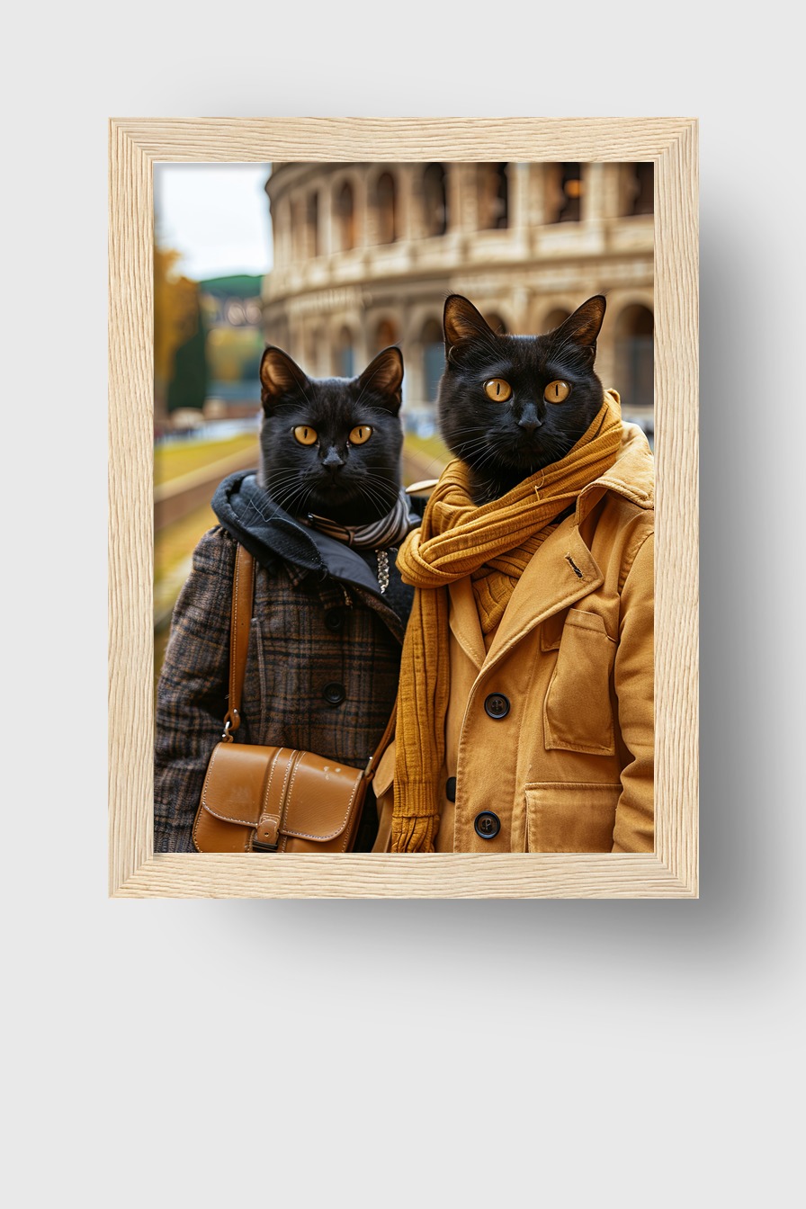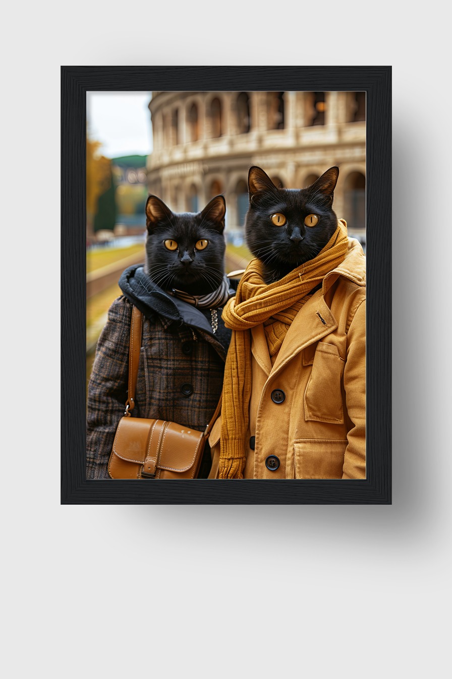 Duo schwarzer Katzen vor antiker Architektur. Poster (170 g/m², halbmatt) hinter bruchsicherem Plexiglas in Kiefernholzrahmen (FSC-zertifiziert). Erhältlich in verschiedenen Farben. Fertig zum Aufhängen mit Set.