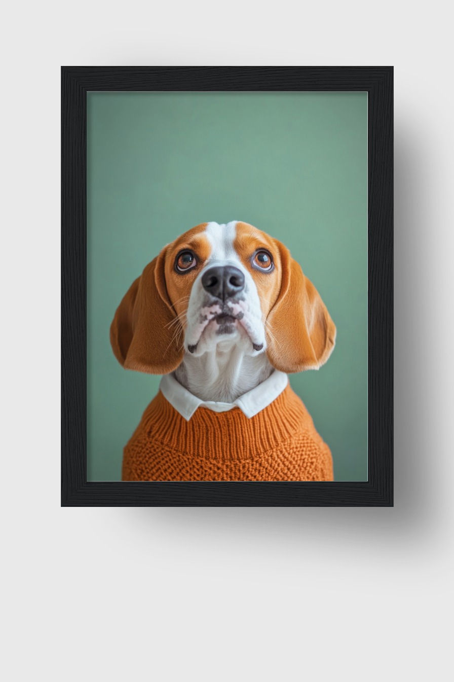 Poster mit Porträt eines Beagles in orangefarbenem Pullover vor grünem Hintergrund, Tierfotografie mit ruhiger Ausstrahlung