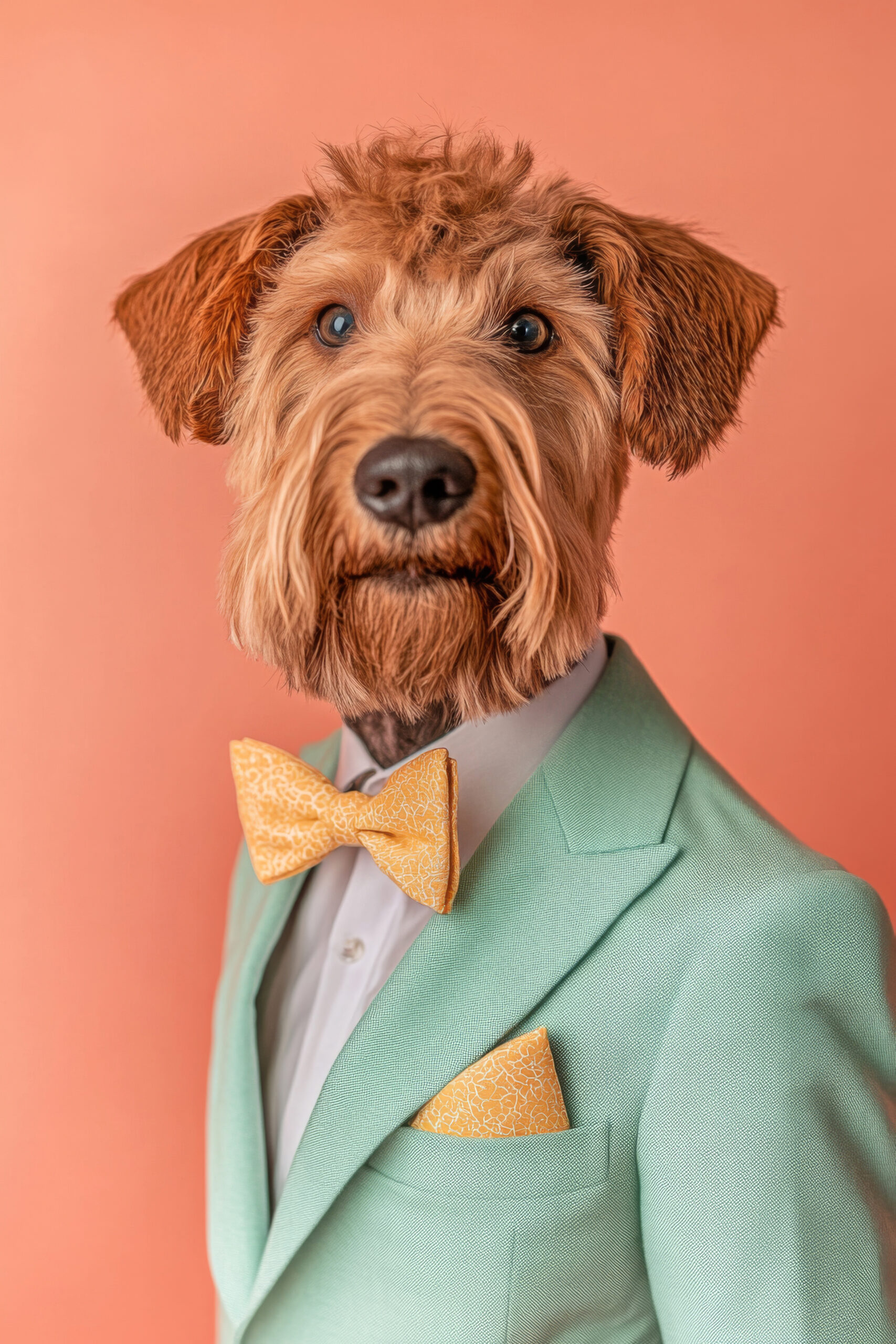 Poster mit Hundeporträt in mintgrünem Anzug und gelber Fliege vor korallfarbenem Hintergrund, moderner dekorativer Kunstdruck