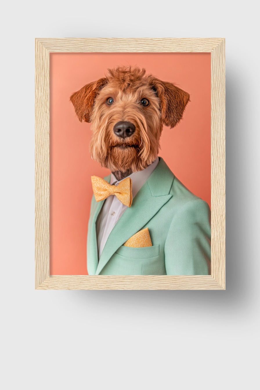 Das Poster zeigt den Hund in Fliege und mintfarbenem Sakko hinter bruchsicherem Plexiglas, eingefasst in einen FSC-zertifizierten Kiefernholzrahmen. Fertig zum sofortigen Aufhängen mit passendem Aufhängeset.