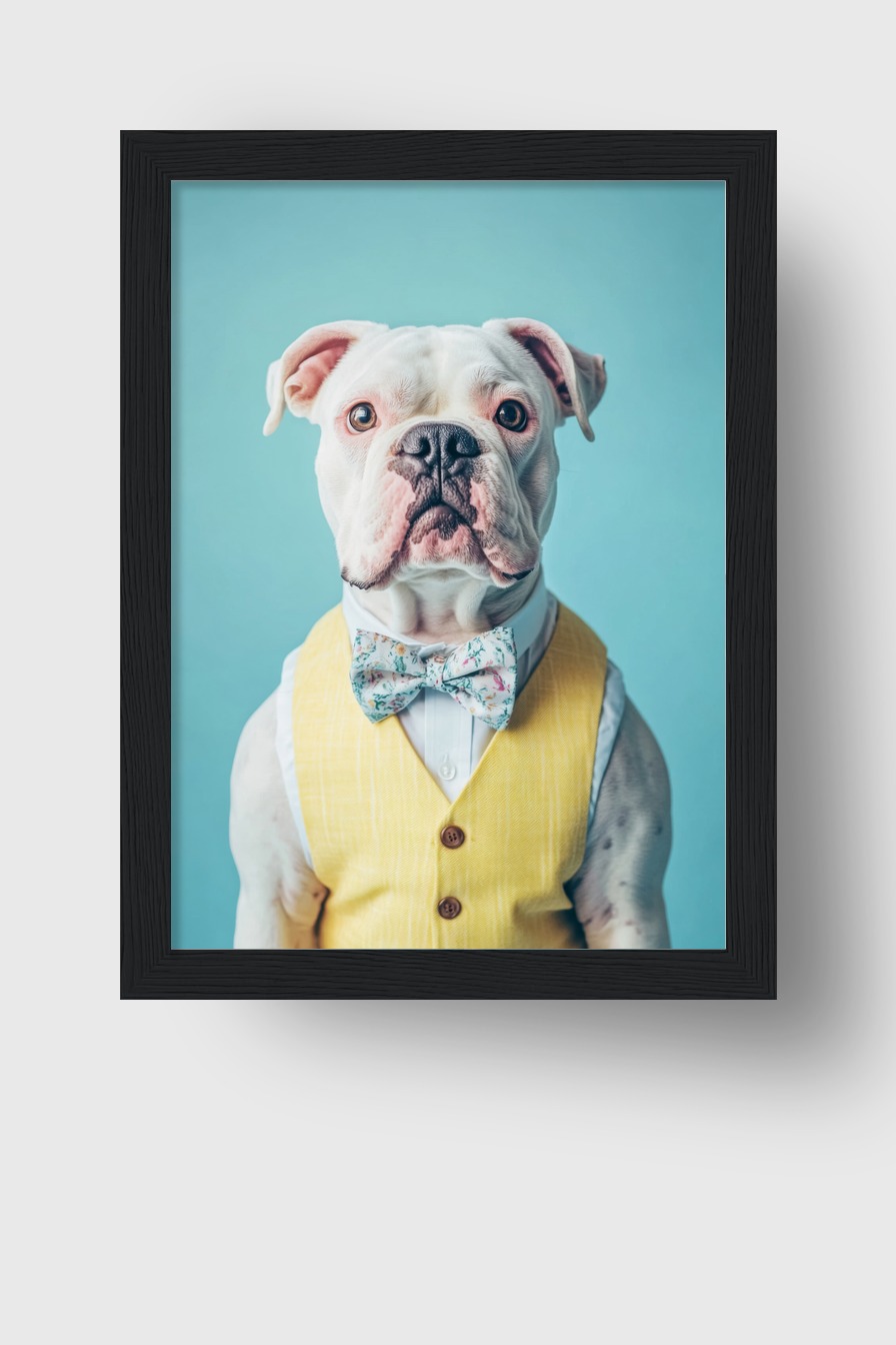 Das Bild zeigt einen weißen Hund in einer gelben Weste mit einer gemusterten Fliege vor einem hellen blauen Hintergrund. Das Portrait strahlt eine besondere Eleganz und Charakter aus.