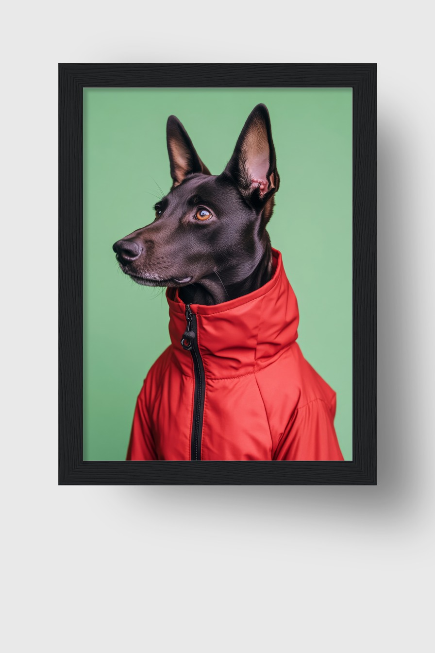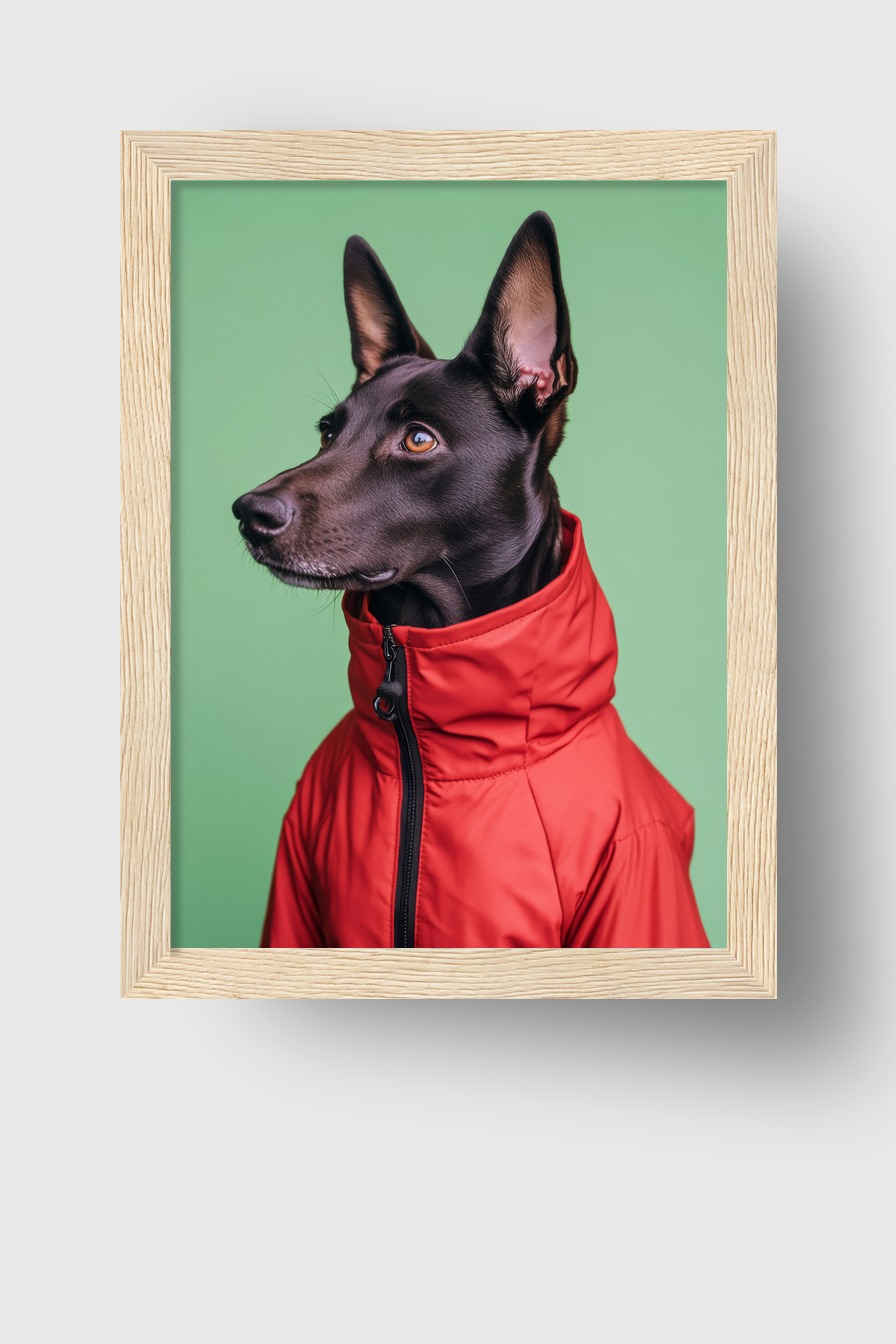 Ein schwarzer Hund mit großen Ohren trägt eine rote Jacke vor einem einfarbigen grünen Hintergrund. Das Bild zeigt das Profil des Hundes detailreich und konzentriert.