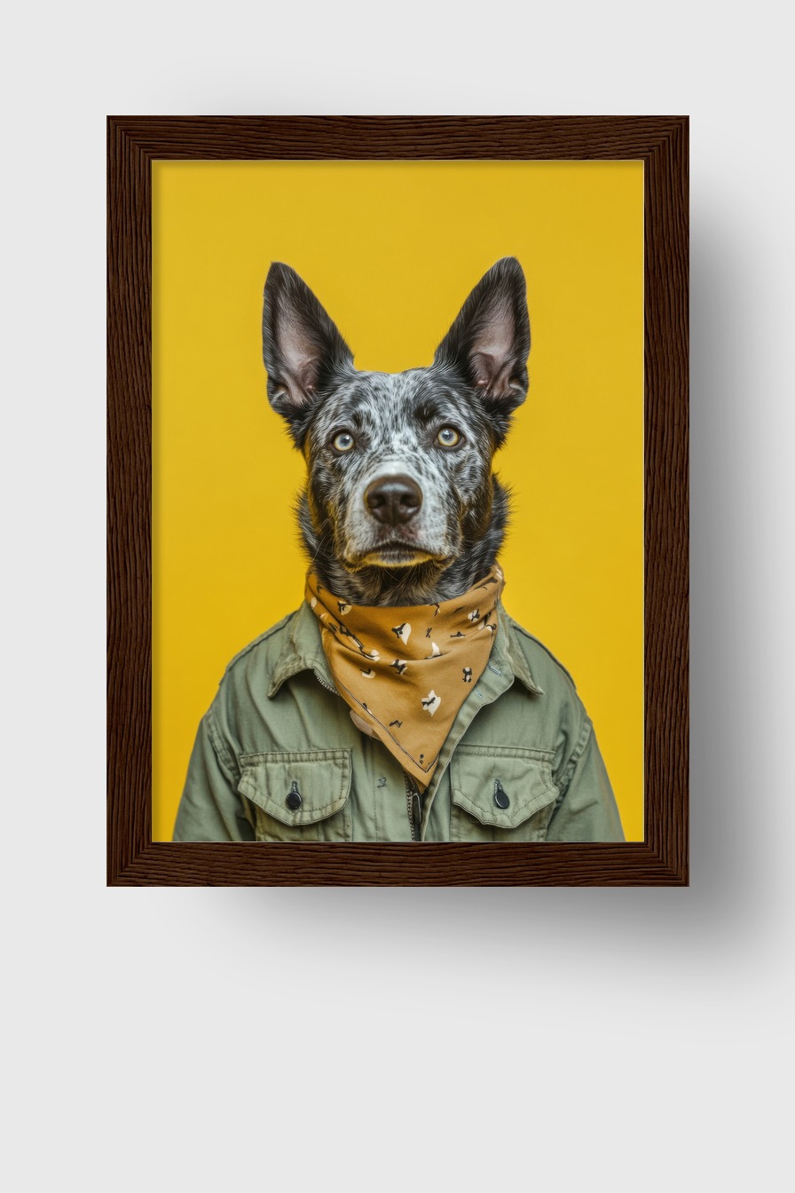 Das Bild zeigt einen Hund mit aufmerksamem Blick, der ein gemustertes Halstuch und eine grüne Jacke trägt. Der gelbe Hintergrund hebt das Motiv klar hervor und wirkt modern.